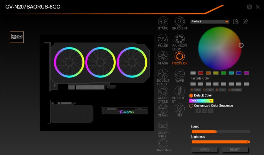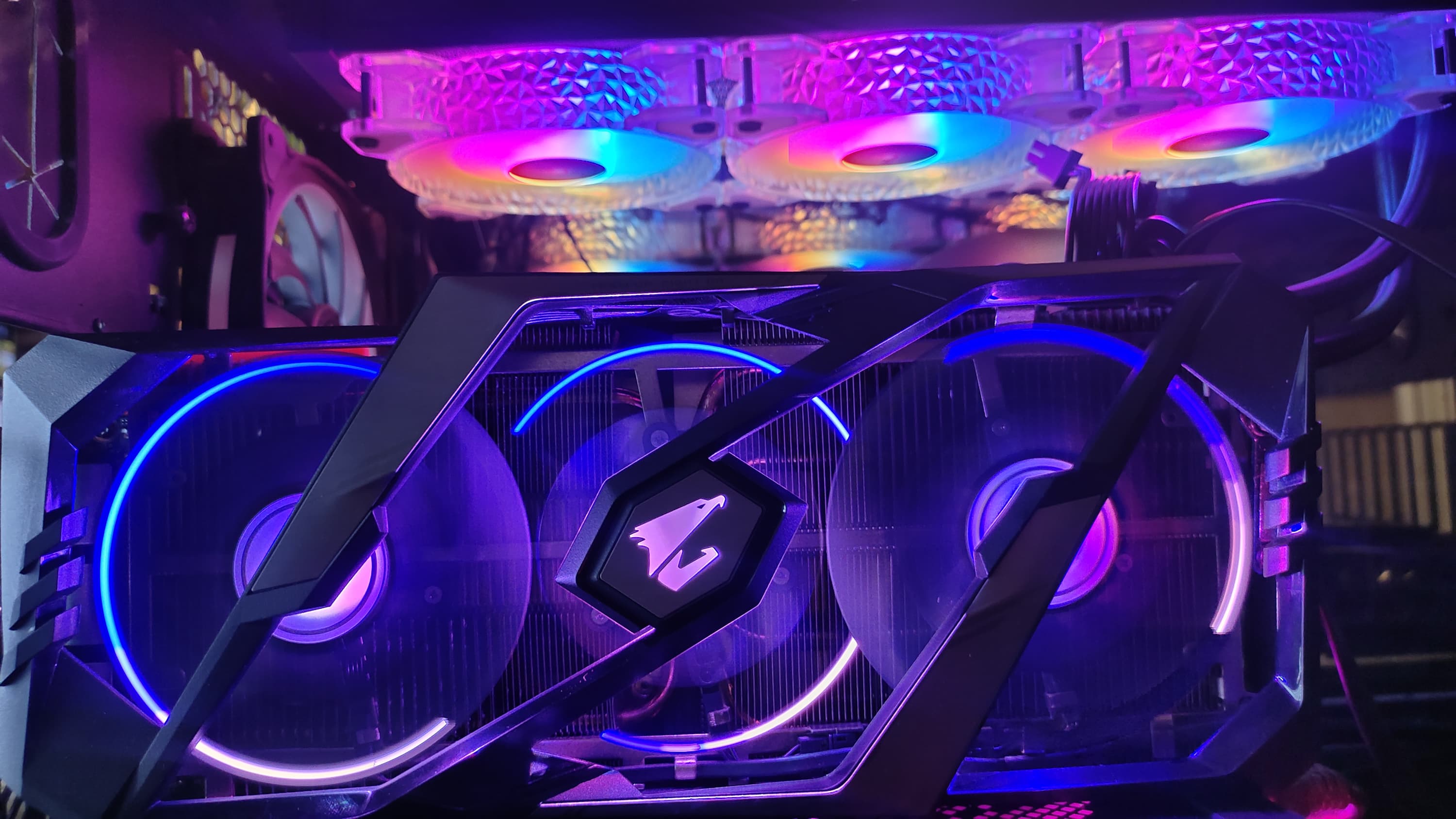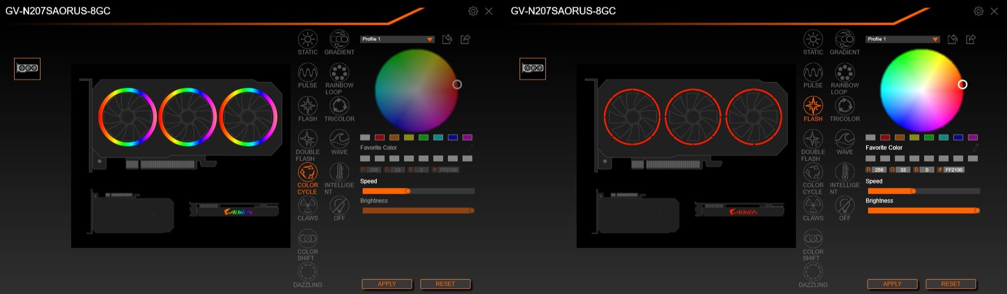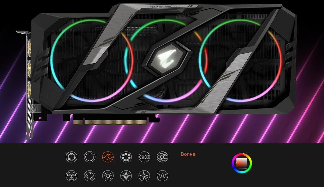 Таким разнообразием режимов подсветки мало кто может похвастать. В серии карт Aorus на базе GeForce RTX 30 имеются свои очень красивые варианты подсветок, однако вот такого уровня, чтобы с вращающимися кольцами, практически нет. Подсветка шикарная: яркая, хорошо сочетающаяся со стилем карты Aorus.