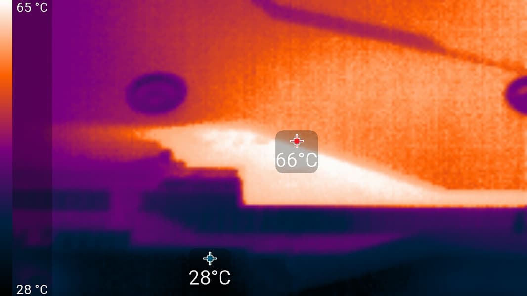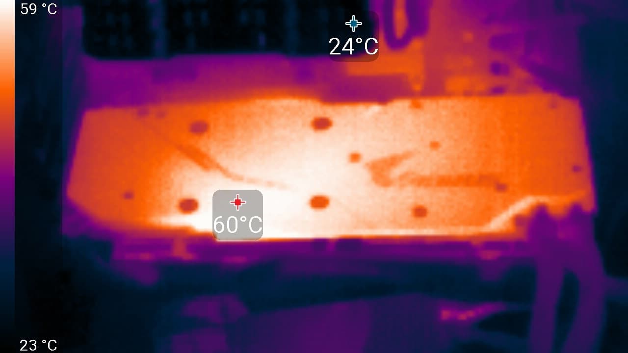 Максимальный нагрев — в центральной части платы, в области GPU.