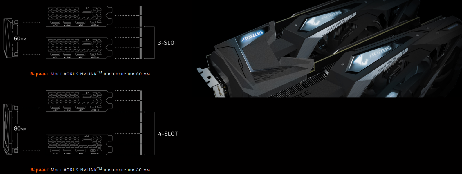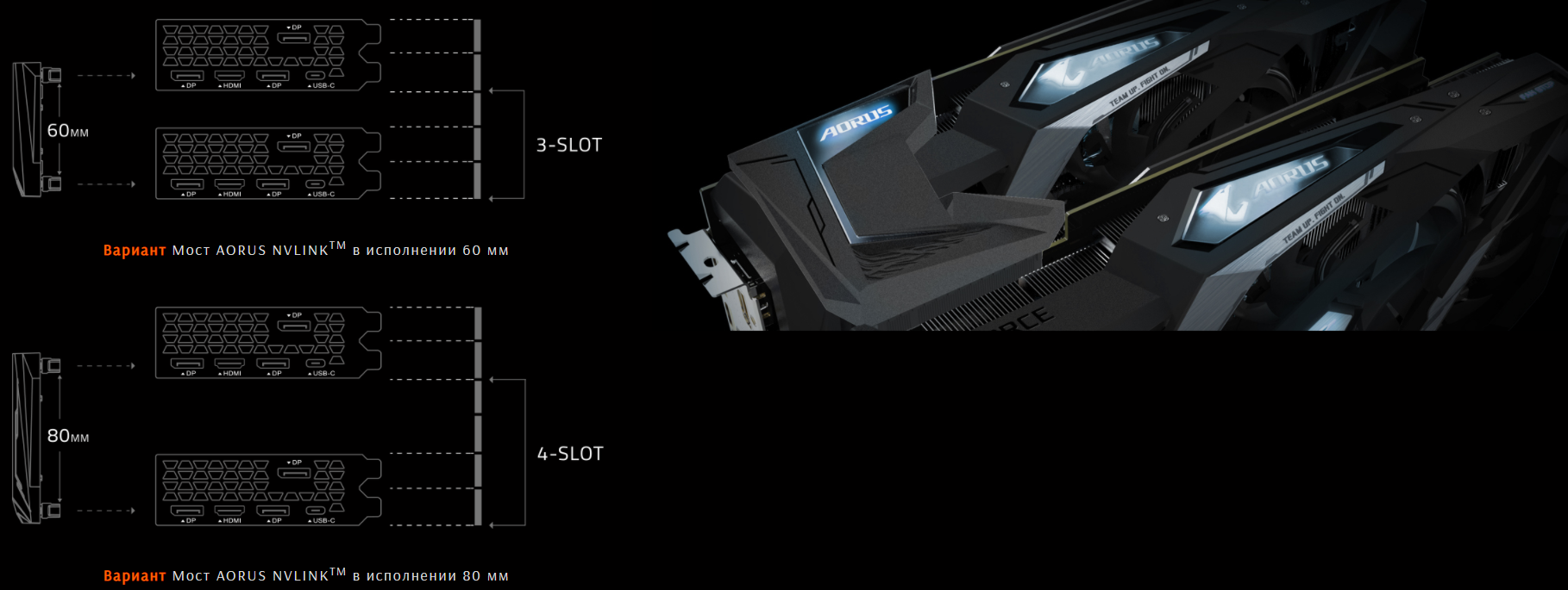 Nvidia NVLink (Nvidia SLI) позволяет объединить ресурсы двух графических плат на базе идентичных ГП GeForce RTX с помощью перемычки NVLink Bridge. Однако поддержка SLI в играх со стороны Nvidia практически прекращена, поэтому объединять 2 карты для получения более высокой производительности в играх сегодня бесполезно. Nvidia SLI поддерживается только в профессиональных приложениях, однако семейство GeForce — не для них (впрочем, имеется много случаев, когда для работы с 3D-моделированием используют игровые видеокарты, но это уже отдельная тема).