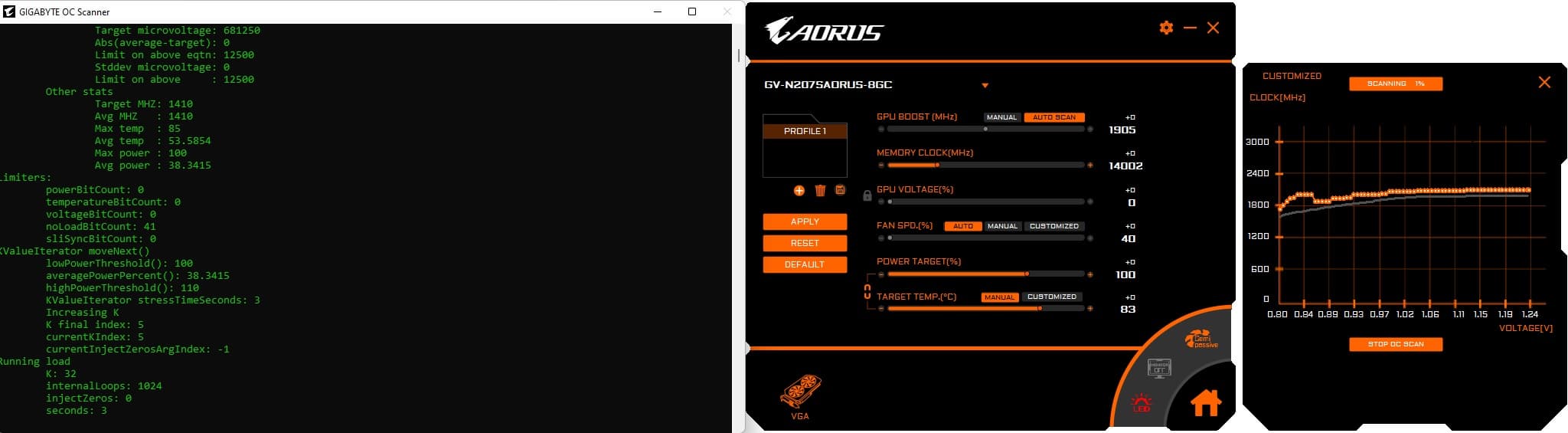 Традиционно внутри программы есть и OC Scanner, то есть программа автоматического разгона. Она максимально «прощупывает» карту для оптимального и безопасного повышения частот. Но, как правило, чрезмерная перестраховка, заложенная в этой утилите, предоставляет очень небольшой прирост по частотам, а следовательно и по производительности.
