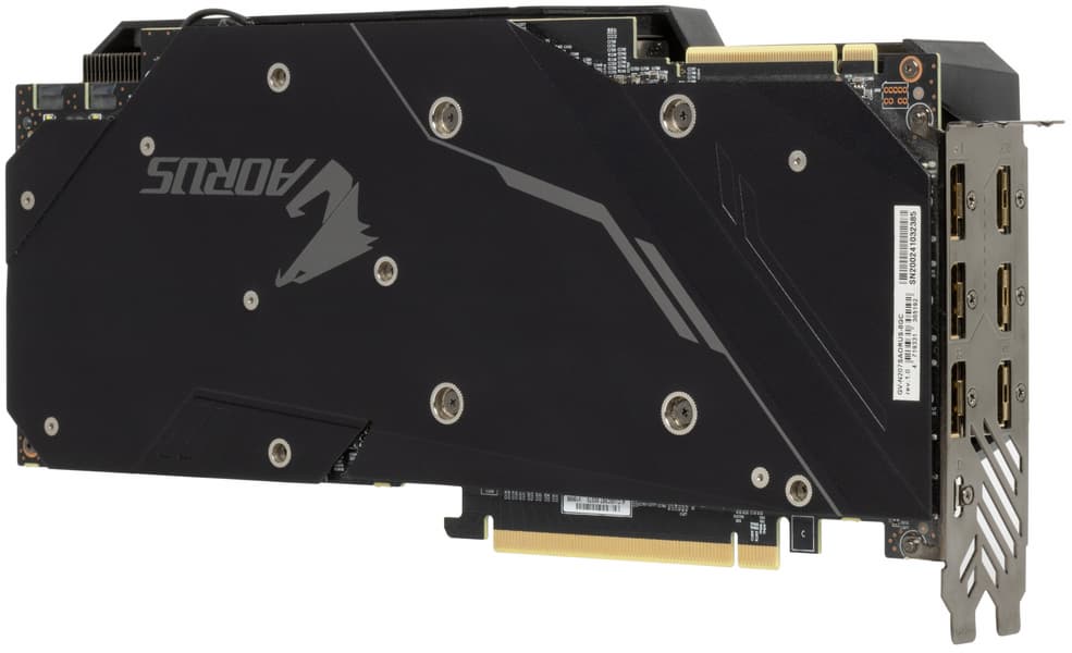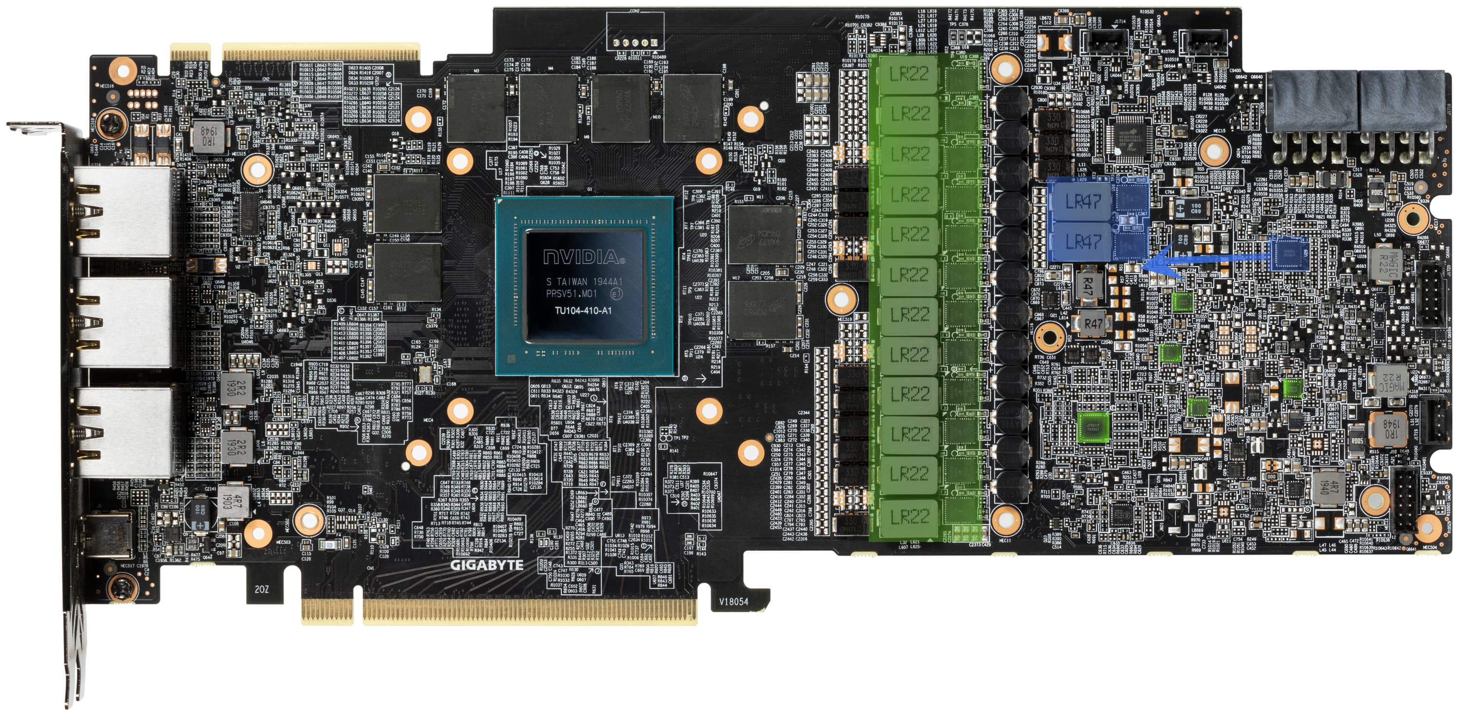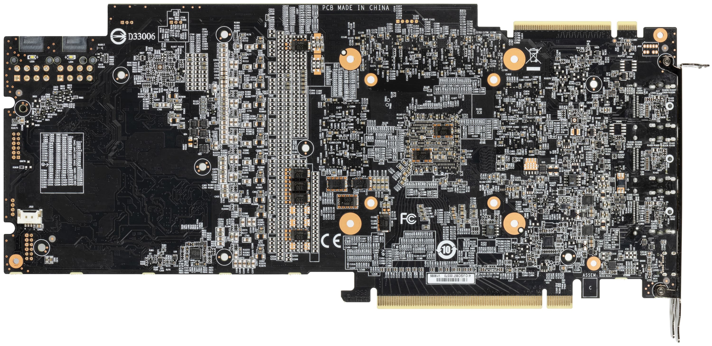 Как всегда, когда мы имеем дело с флагманской серией Aorus, видеокарта имеет уникальный дизайн. Инженеры Gigabyte хорошо потрудились над дизайном PCB, который с эталонным схож только в плане размещения микросхем памяти вокруг GPU.