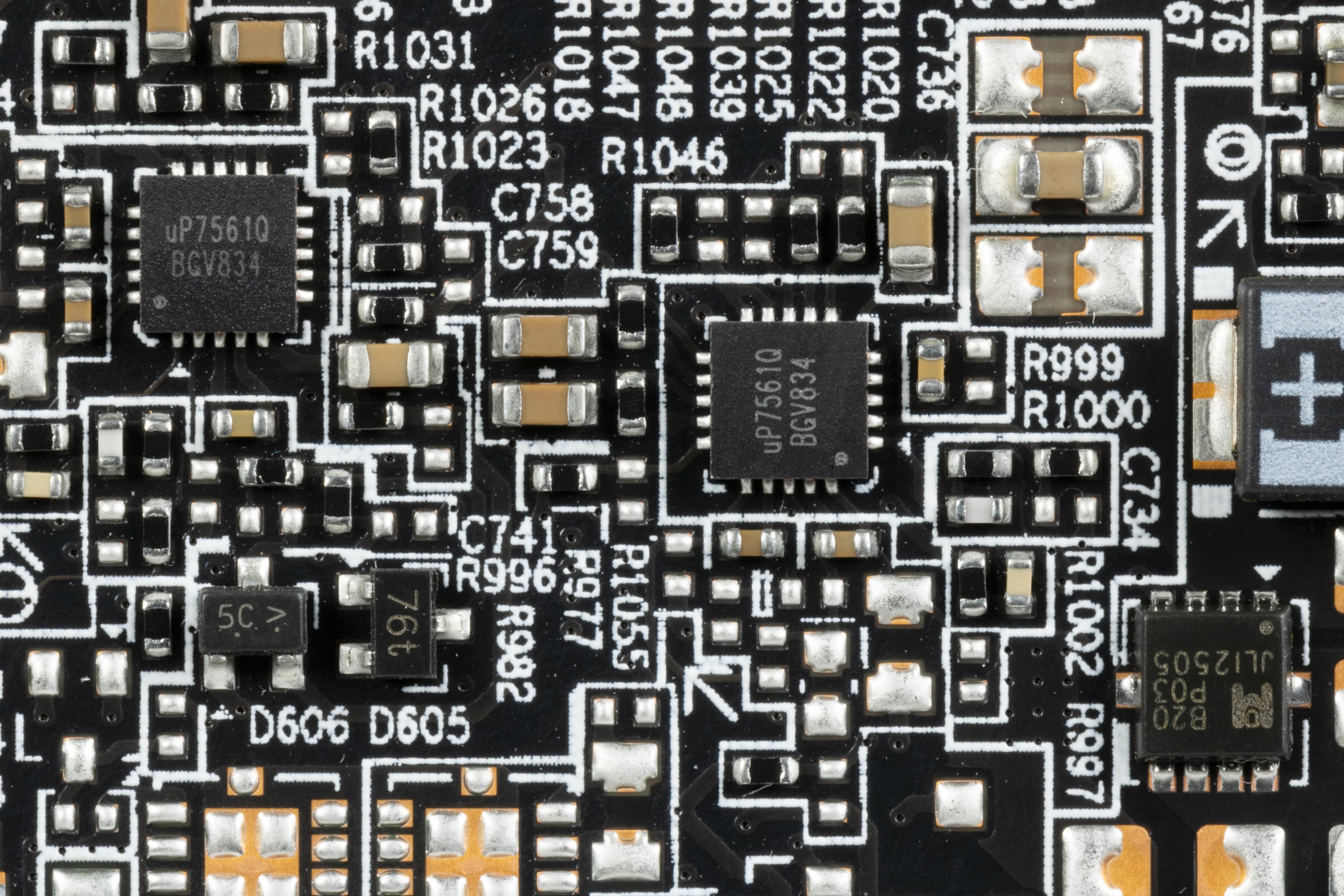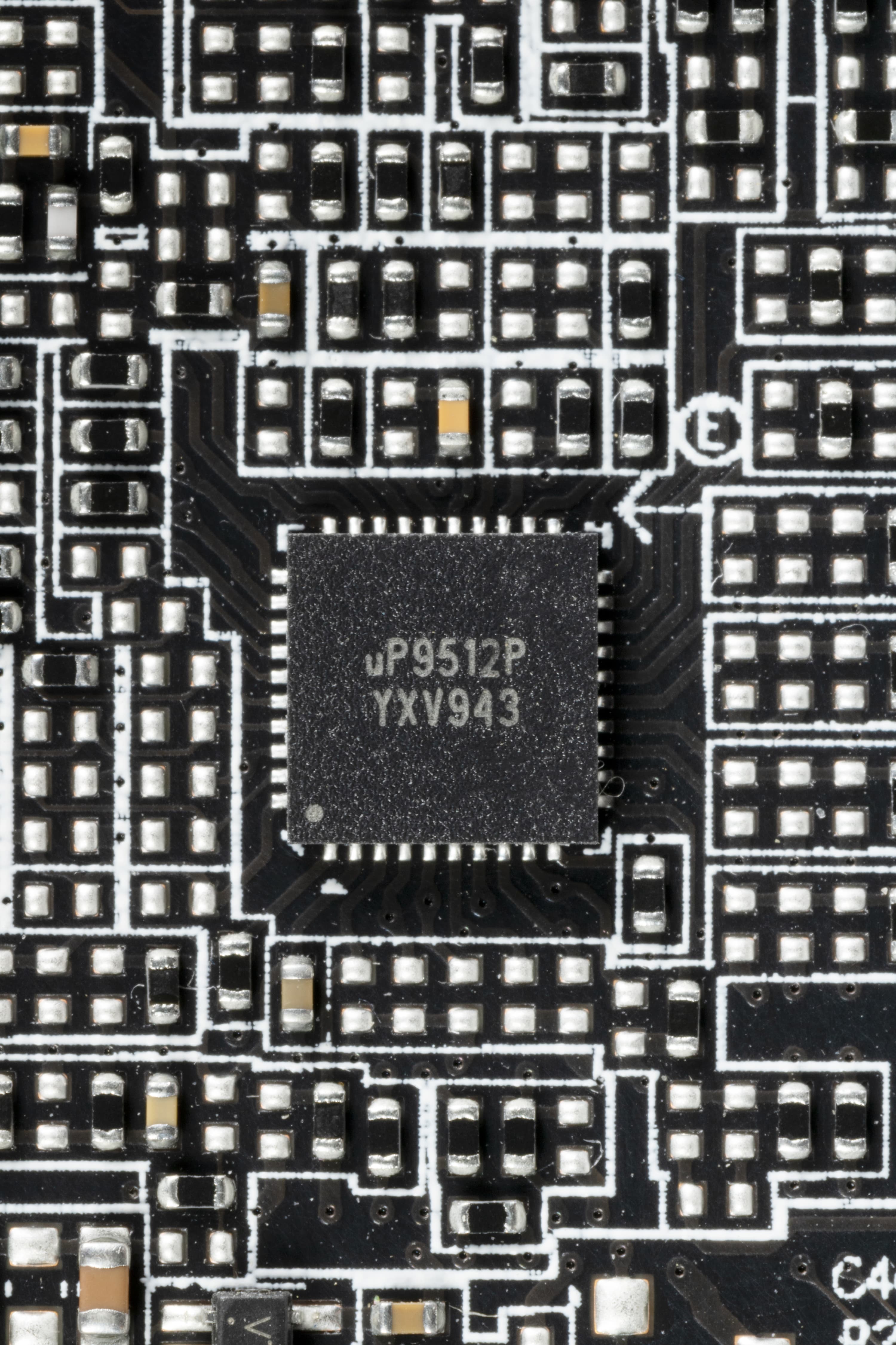 Все управляющие контроллеры находятся на лицевой стороне карты. Для управления схемой питания ядра используются аж пять(!) ШИМ-контроллеров: один uP9512R (uPI Semiconductor), способный работать максимум с 8 фазами питания, и четыре uP7561Q (uPI Semiconductor), рассчитанные каждый на 2 фазы. Еще один ШИМ-контроллер uP9512R отвечает за питание фаз питания микросхем памяти.