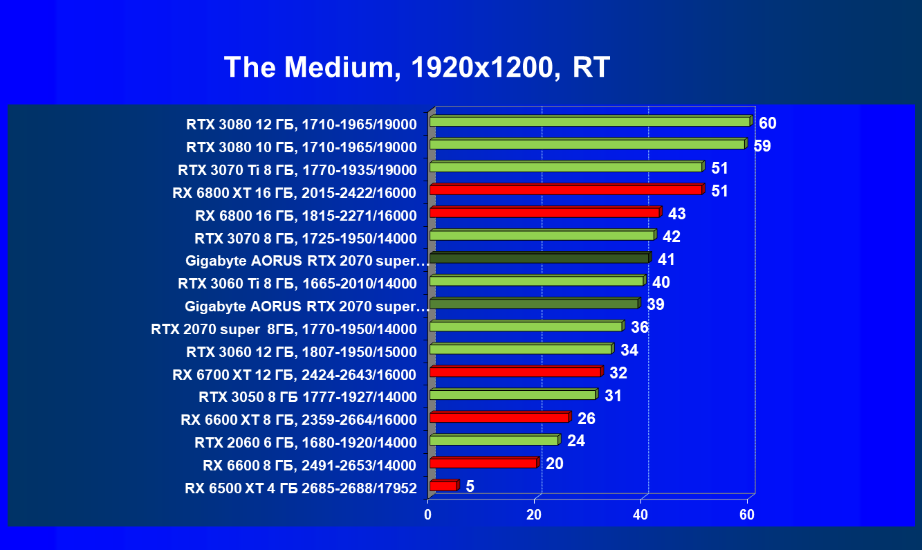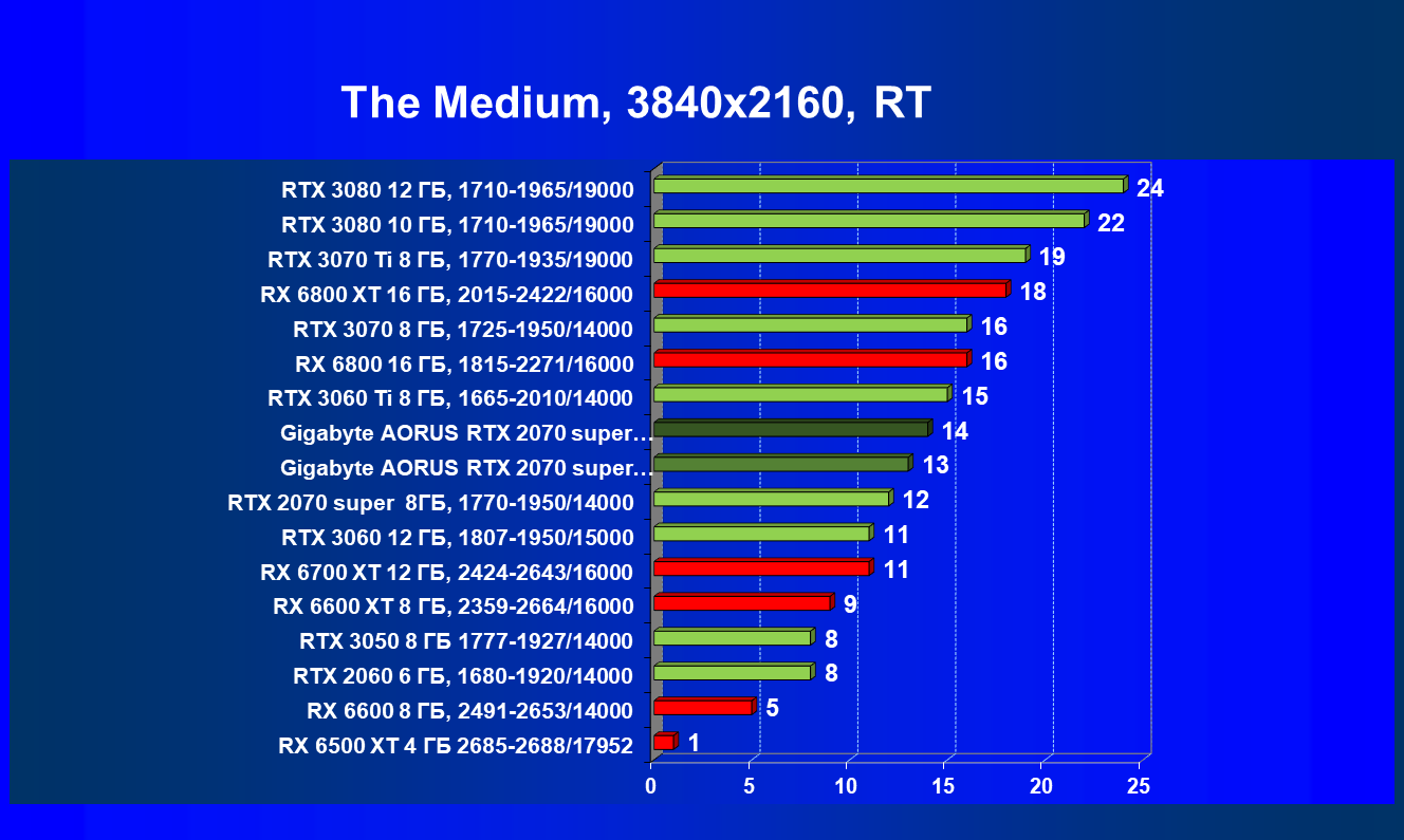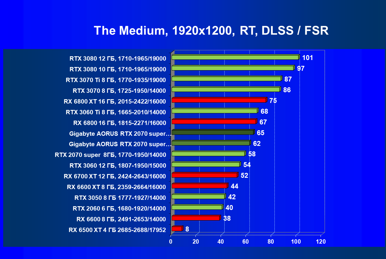 Рейтинг составлен по 9 тестам с применением технологии трассировки лучей (с Nvidia DLSS и с AMD FSR в играх God of War, The Medium и Far Cry 6). Этот рейтинг нормирован по самому слабому ускорителю в данной группе — Radeon RX 6500 XT (то есть сочетание скорости и функций Radeon RX 6500 XT приняты за 100%).