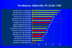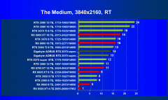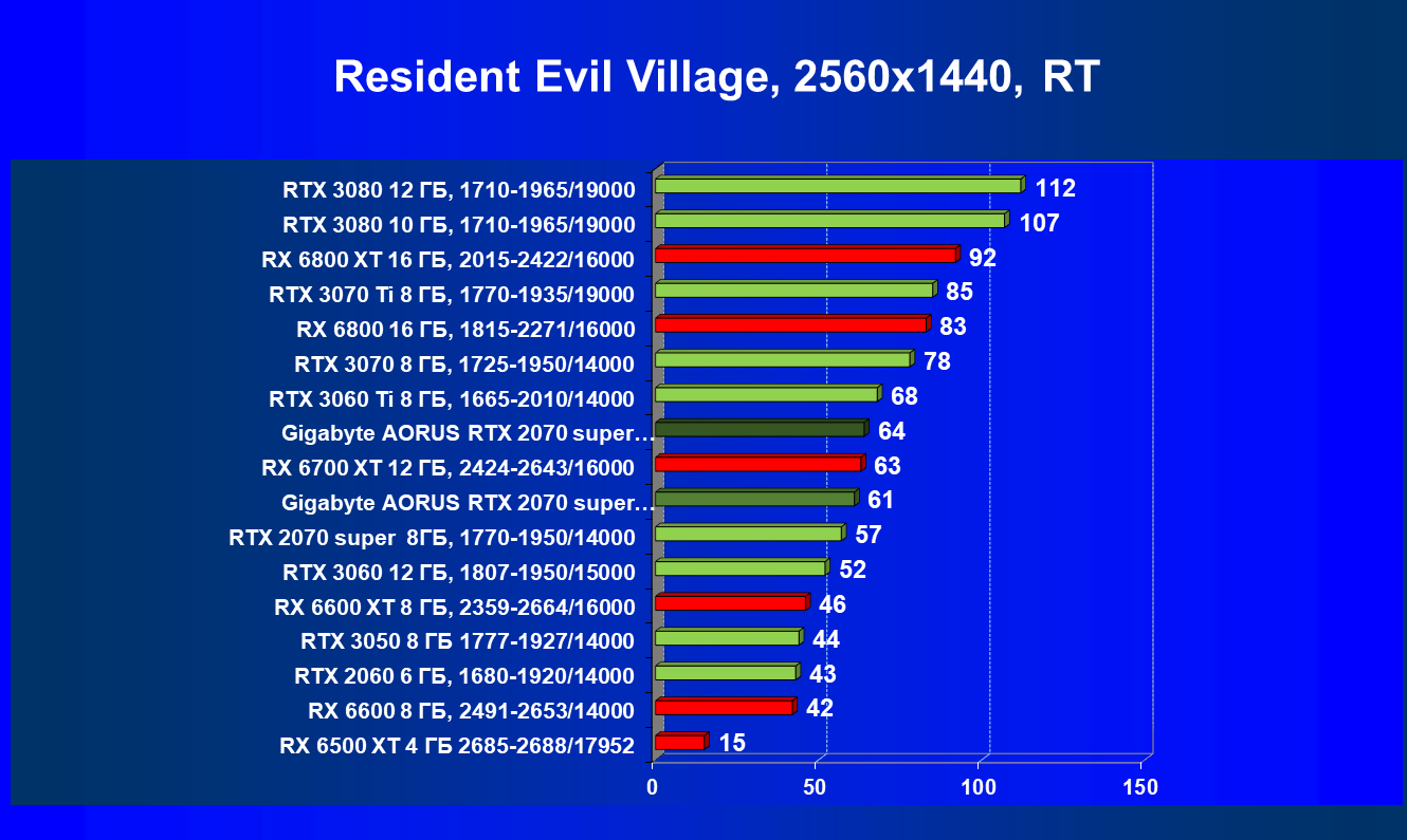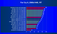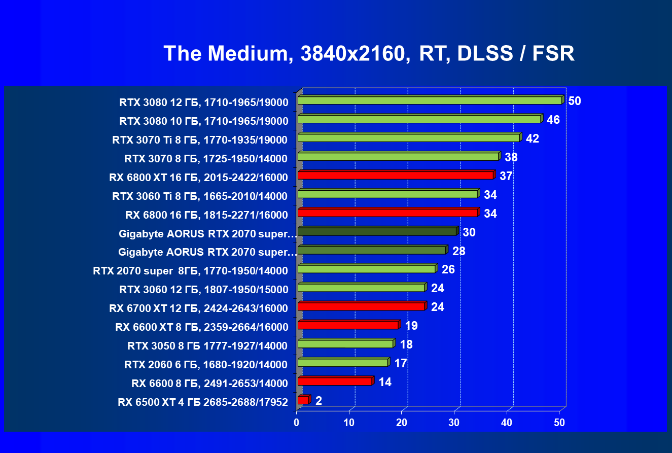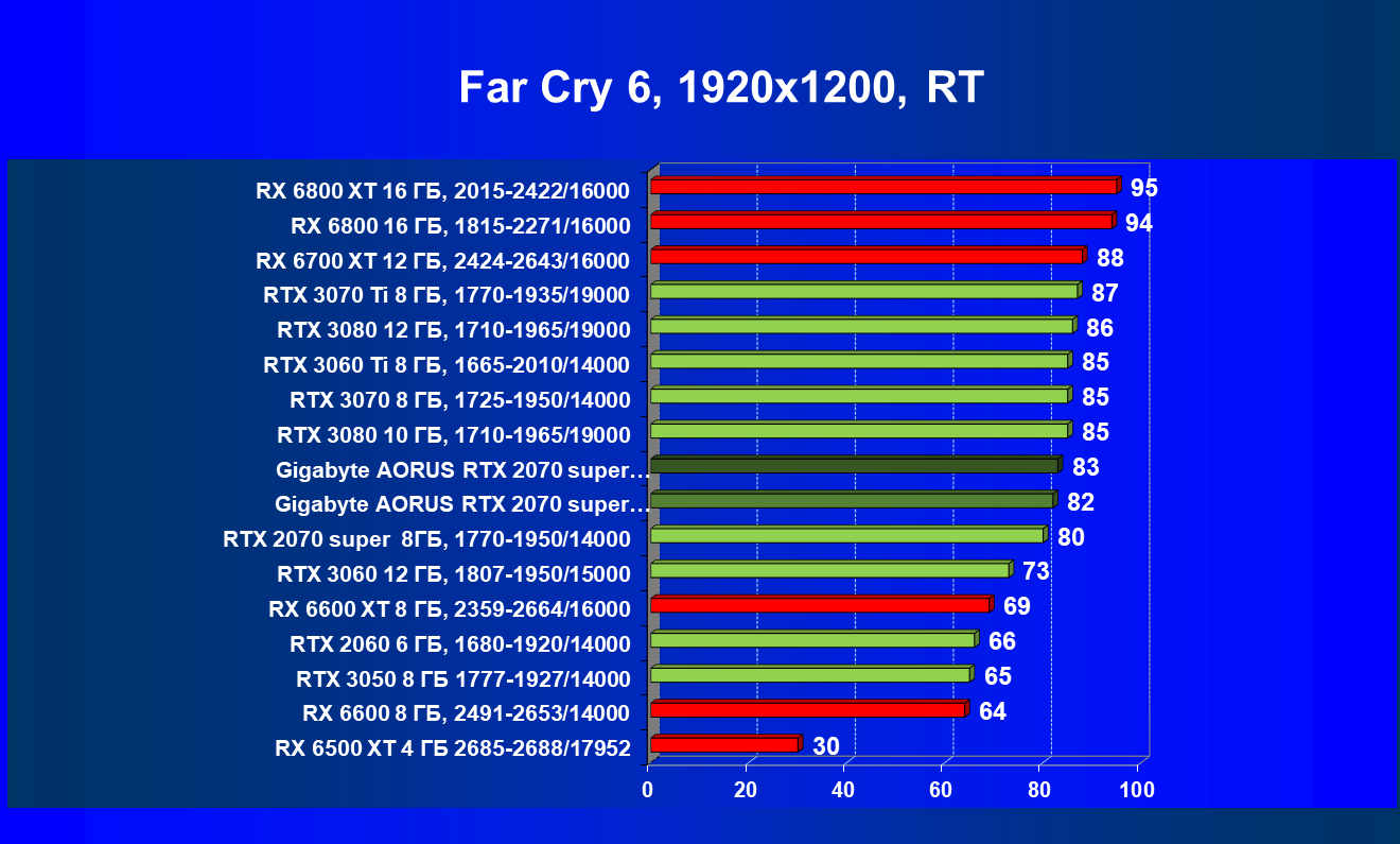 Рейтинг составлен по 9 тестам с применением технологии трассировки лучей (с Nvidia DLSS и с AMD FSR в играх God of War, The Medium и Far Cry 6). Этот рейтинг нормирован по самому слабому ускорителю в данной группе — Radeon RX 6500 XT (то есть сочетание скорости и функций Radeon RX 6500 XT приняты за 100%).