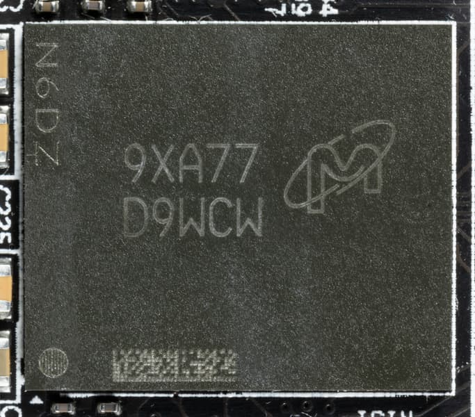 Карта имеет 8 ГБ памяти GDDR6 SDRAM, размещенной в 8 микросхемах по 8 Гбит на лицевой стороне PCB. Микросхемы памяти Micron (GDDR6) рассчитаны на условную номинальную частоту работы в 3500 (14000) МГц.