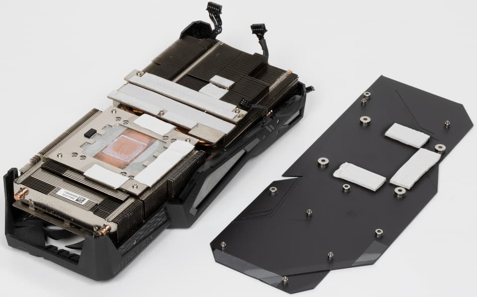 Перед нами кулер серии Windforce Stack с 3 вентиляторами диаметром 100 мм. Радиатор скреплен пятью тепловыми трубками. В то время как иные производители используют для передачи тепла с кристалла GPU полированное основание, а подчас даже испарительную камеру, Gigabyte предпочитает прямой контакт между чипом и расплющенными концами тепловых трубок, впрессованных в подошву радиатора. На ней же имеется термоинтерфейс для охлаждения микросхем памяти. К силовым элементам конвертера питания прижимаются дополнительные подошвы с термопрокладками. На обороте карты установлена толстая пластина, служащая не только элементом жесткости, но и охладителем PCB (через термоинтерфейс в районе микросхем памяти). Сам радиатор сконструирован с разными по высоте ребрами, что повышает проходимость воздуха и увеличивает теплоотвод.