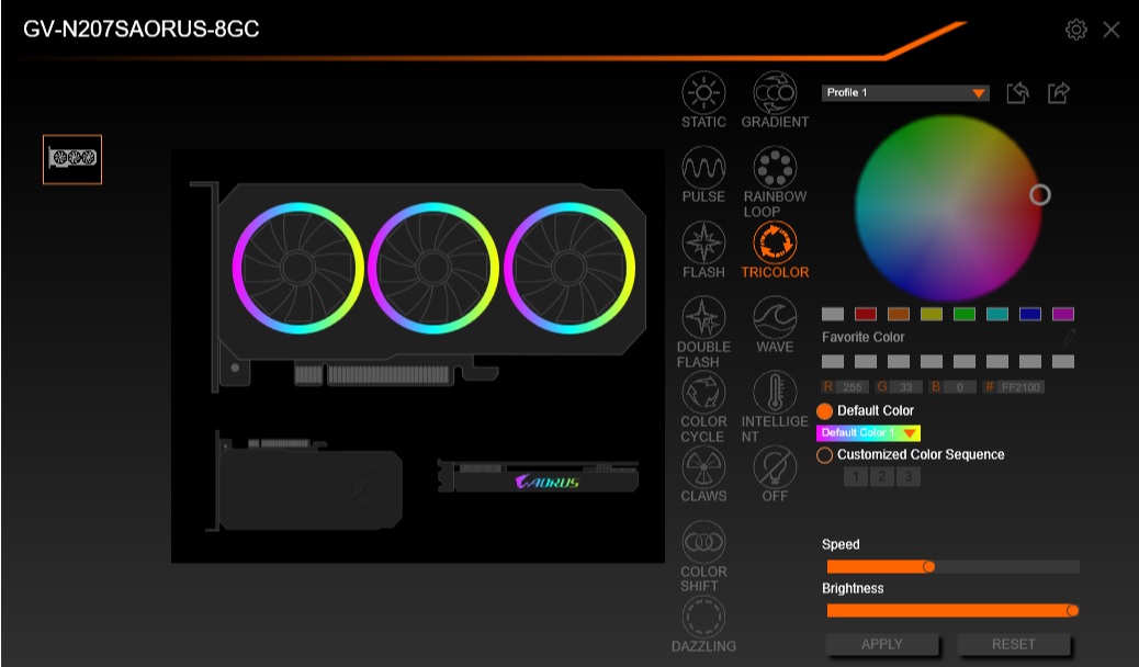 Внутри Aorus Engine имеется и утилита RGB Fusion для управления подсветкой. Выбор режимов весьма большой. Детально — в разделе по подсветке.