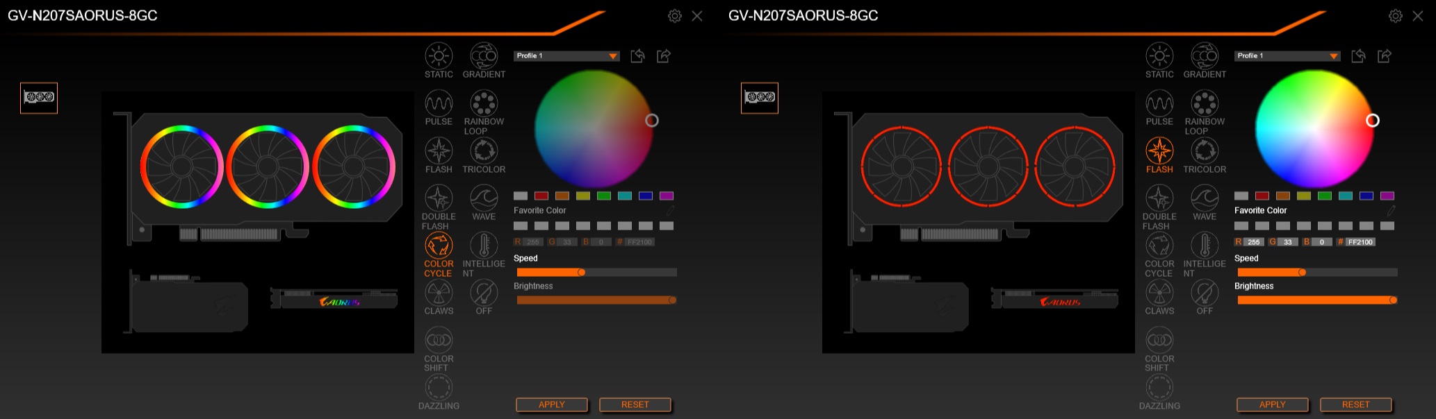 Как выше уже было сказано, фирменная утилита RGB Fusion управляет подсветкой, которая у этой карты выглядит как салют на празднике: подсвечивается не только логотип компании на верхнем торце, но и лопасти снабжены светодиодами, которые загораются только при вращении вентиляторов, образуя красивые пересекающиеся окружности.