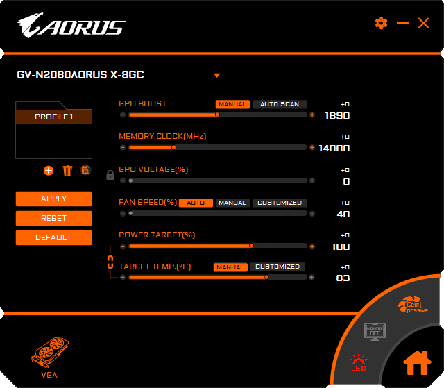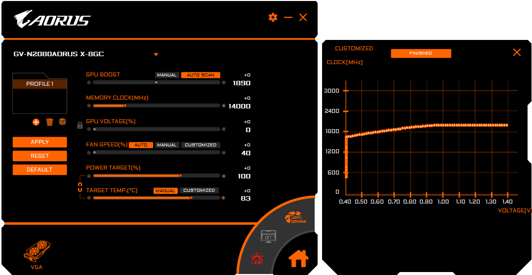 До сего момента мы рекомендовали использовать утилиту EVGA Precision X1 или версию 4.6.0 популярной утилиты MSI Afterburner, с помощью которых можно не только повысить частоты работы, но и запустить Nvidia Scanner, который поможет определить безопасный максимум работы ядра и памяти, то есть самый быстрый режим работы в 3D. Так вот, Nvidia Scanner имеется и в утилите Aorus, с его помощью были установлены максимальные частоты работы данного экземпляра карты при условии стабильной работы: 2115/14312 МГц. Это уже +8% к частотам карты Founder’s Edition.