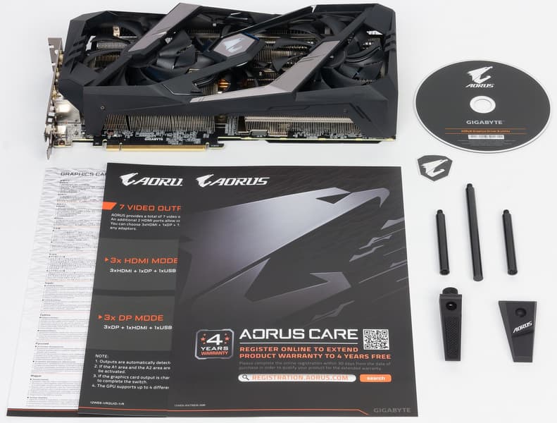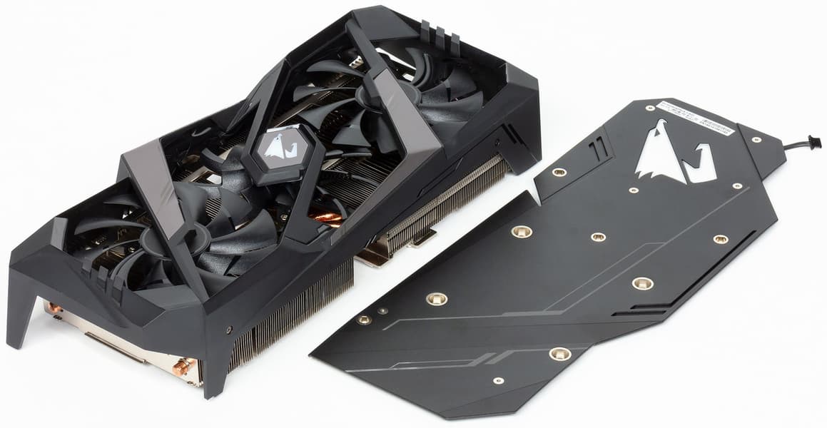 Главной частью кулера являются два массивных пластинчатых никелированных радиатора, соединенные между собой тепловыми трубками, впрессованными в основание одного из них, которые обеспечивают равномерное распределение тепла по ребрам радиаторов. Ребра расположены под разными углами, что помогает более эффективному проникновению охлаждающего воздуха. Поверх радиаторов установлен кожух с тремя вентиляторами, работающими на одинаковой частоте вращения. У этих вентиляторов (Gigabyte называет их Stack Fan) не только особый профиль лопаток, они еще и расположены в разных плоскостях, при этом средний вентилятор вращается в противоположном направлении (получается эффект «шестеренок»). По словам производителя, это позволяет резко увеличить КПД охлаждения радиаторов. Следует также напомнить, что кулеры этой серии останавливают вентиляторы в случае простоя или малой нагрузки (если температура GPU не выше 56-60 градусов). Поэтому не стоит пугаться, если при запуске ПК вентиляторы на ускорителе не вращаются. Кстати, индикатор на торце кулера информирует о том, вращаются ли вентиляторы. Микросхемы памяти охлаждаются пластиной (она сделана из медного сплава), прикрученной к основанию радиатора на ядре, а силовые транзисторы охлаждаются отдельной пластиной, прикрученной ко второму радиатору. На обороте видеокарты установлена толстая пластина, которая обеспечивает жесткость относительно массивной видеокарты (предотвращая изгиб печатной платы), а также служит дополнительным радиатором для PCB (она прижата к текстолиту через термоинтерфейс). СО оснащена подсветкой, цветом которой можно управлять с помощью утилиты Aorus Engine.