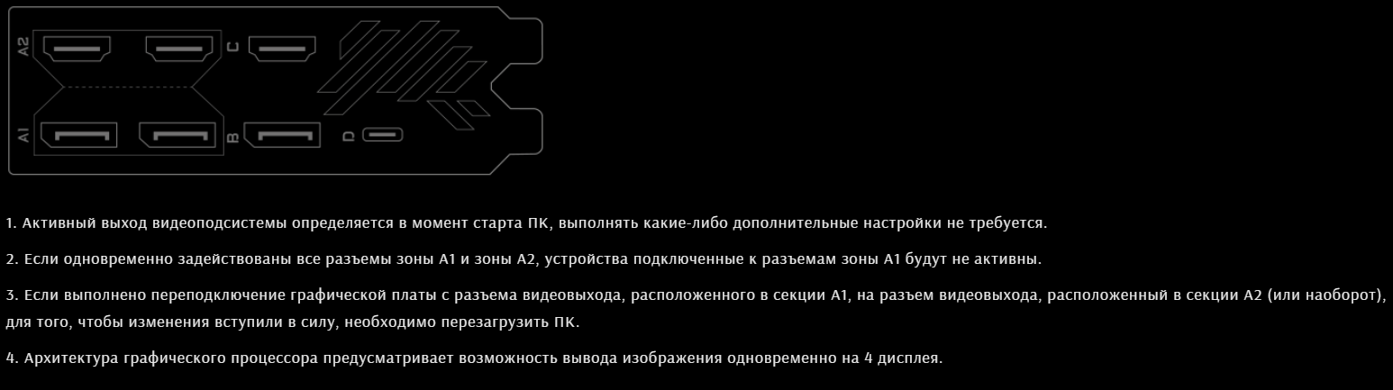 Как видно из инструкции по подключению мониторов, есть два режима: 3 монитора с HDMI + 1 DP либо, наоборот, 3 монитора с DP + 1 HDMI. При включении компьютера видеокарта автоматически определяет набор подключений, поэтому настраивать ничего не надо.
