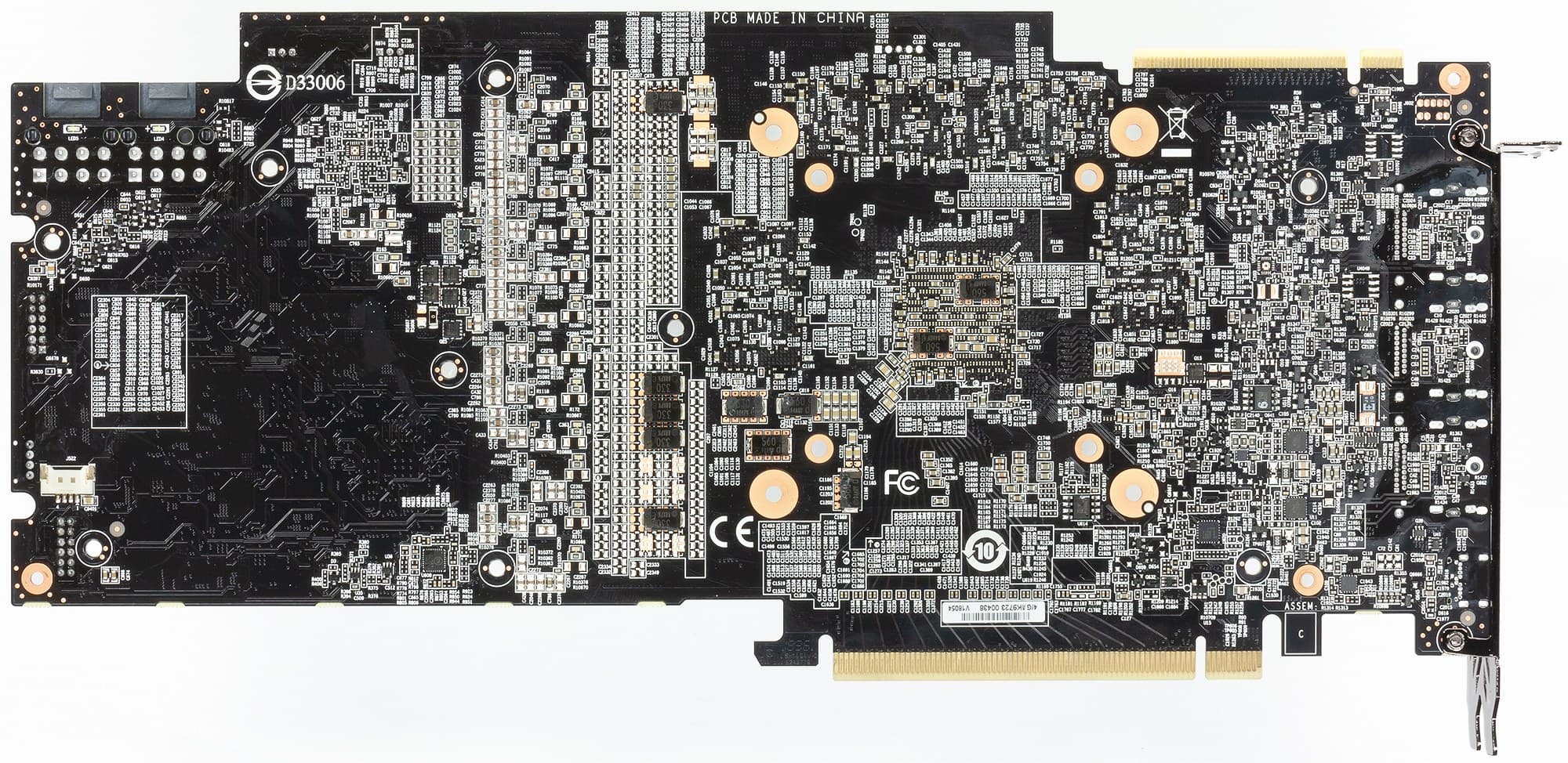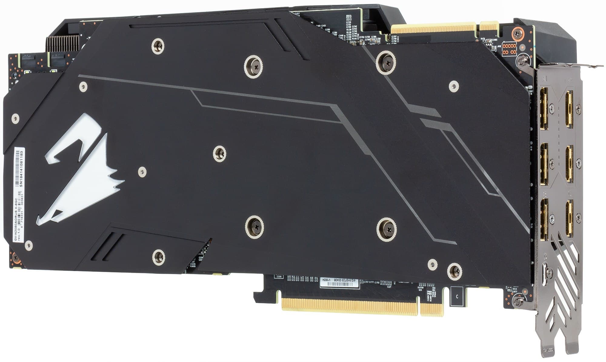 В целом блок питания у карты Aorus усилен. И если у варианта Nvidia Founder’s Edition схема питания построена на базе 8-фазного цифрового преобразователя iMon DrMOS, то у данной карты фаз 12+2. В целом динамическая система управления питанием способна осуществлять мониторинг тока чаще раза в миллисекунду, что дает жесткий контроль над поступающим на ядро питанием. Схема питания управляется двумя цифровыми контроллерами. Учитывая выросшее количество фаз питания, а значит, и соответствующих этому элементов, PCB стала более высокой, чем у Founder’s Edition. Разумеется, для блока питания используется самая современная элементная база. Печатная плата имеет специальное покрытие, защищающее ее от накопления пыли, и, что самое важное, при попадании влаги (это актуально для мощных современных ПК с ЖСО, которые иногда (особенно при непрофессиональной сборке) могут подтекать, подвергая опасности весь набор плат/карт в компьютере). Производитель также заявляет о высоком качестве производства печатных плат без острых концов пайки и т. п. Снаружи этого уж точно не видно: PCB плотно закрыта системой охлаждения и задней крышкой.