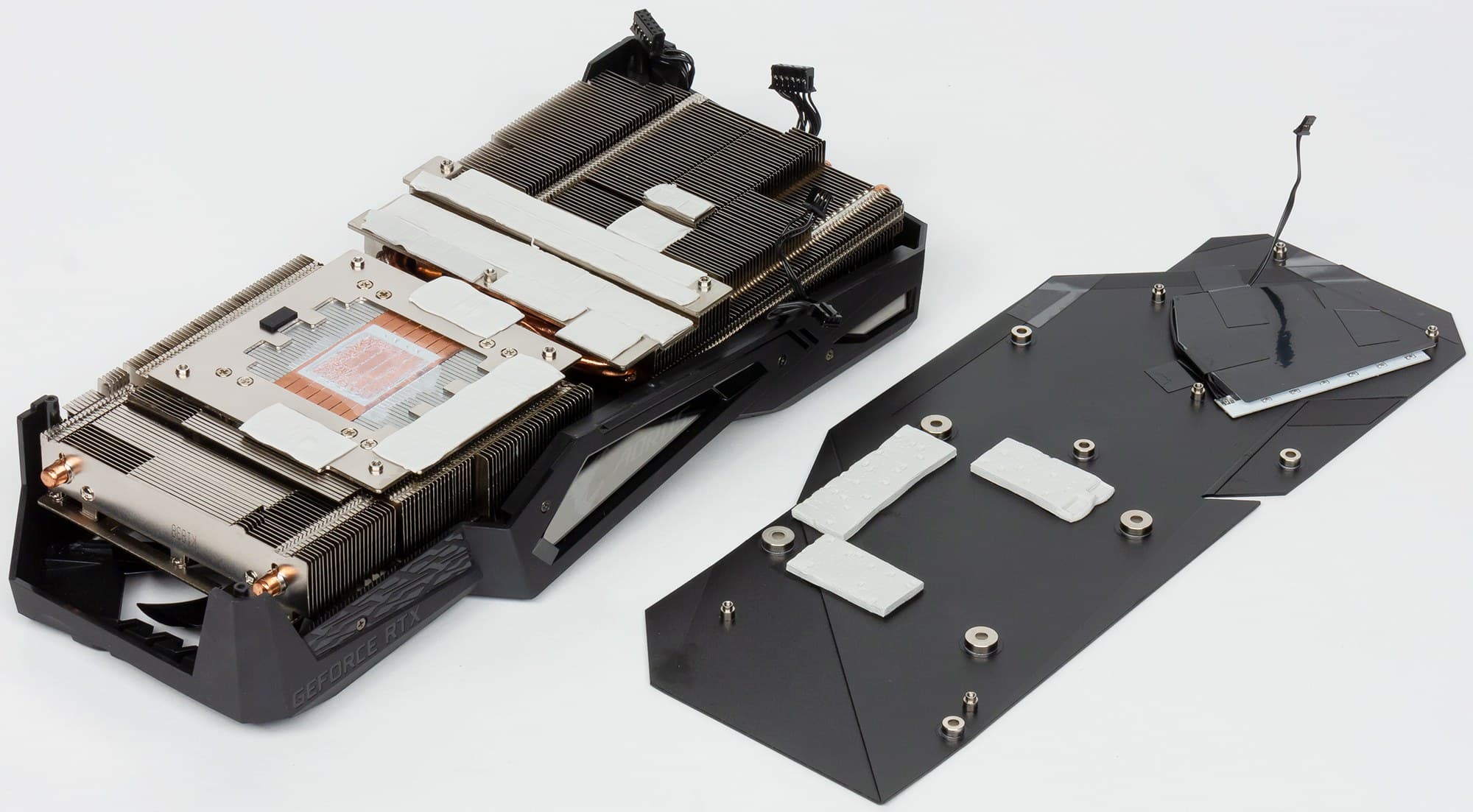 Вторым достоинством ускорителя является эффективный и относительно тихий кулер. Система охлаждения увеличивает габариты платы относительно варианта Founder’s Edition, но покупателей ускорителей премиального класса трудно удивить «трехслотовыми» картами длиной около 30 см. У кулера очень интересная подсветка, однако пользователю придется потрудиться, чтобы сделать возможной демонстрацию этой прелести: надо купить корпус с прозрачной стенкой и приобрести райзер, позволяющий вывернуть карту на 90 градусов (а еще решить вопрос, как уместить в корпусе все остальное). Видел умельцев, приспособивших в корпусе систему зеркал для таких видеокарт.