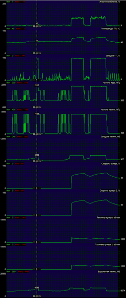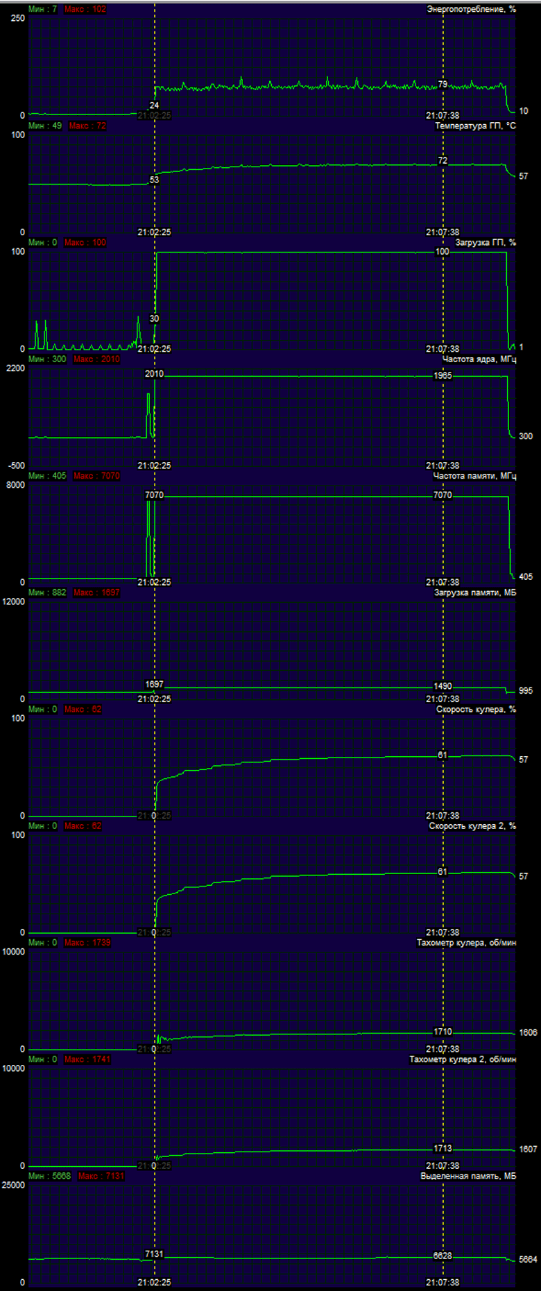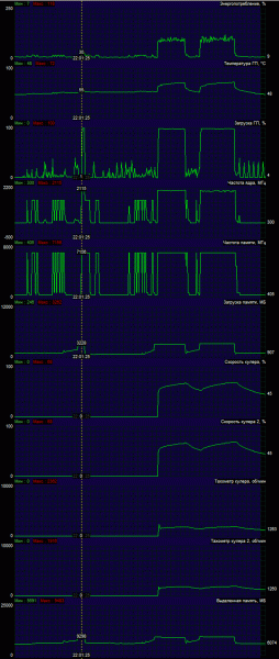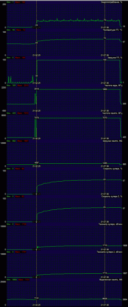 После 6-часового прогона под нагрузкой максимальная температура ядра не превысила 72 градусов, что является отличным результатом для видеокарты такого уровня.