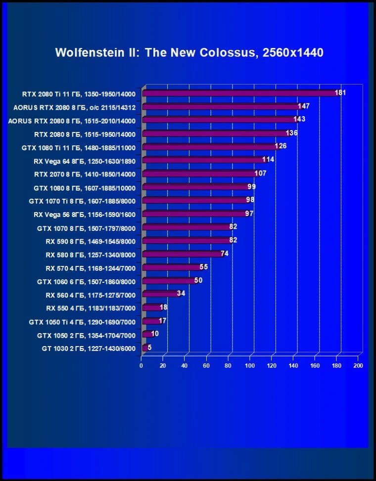 Рейтинг ускорителей iXBT.com демонстрирует нам функциональность видеокарт друг относительно друга и нормирован по самому слабому ускорителю — GeForce GT 1030 (то есть сочетание скорости и функций GT1030 приняты за 100%). Рейтинги ведутся по 20 ежемесячно исследуемым нами акселераторам в рамках проекта Лучшая видеокарта месяца. Из общего списка выбирается группа карт для анализа, куда входят RTX 2080 и его конкуренты. Учитывая, что RTX 2080 в основном нацелен на использование в разрешении 2560×1440, в формировании рейтинга участвовали показатели производительности видеокарт именно в этом разрешении.