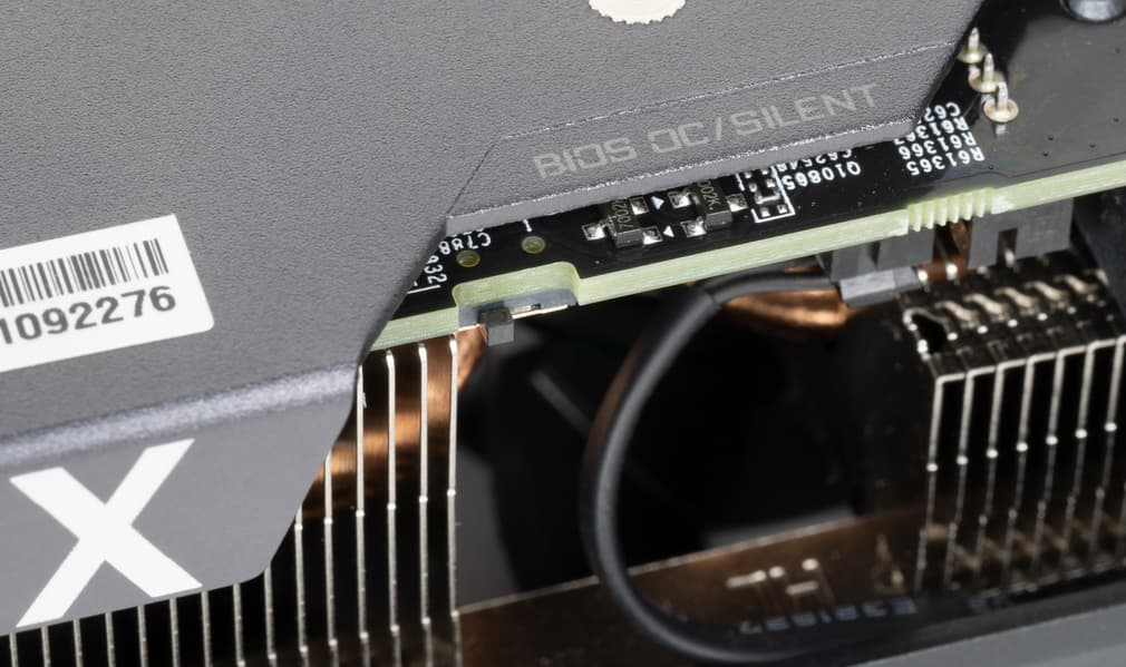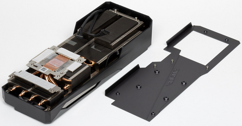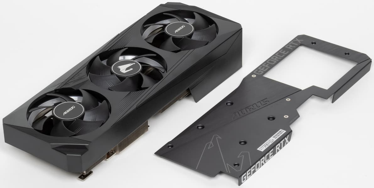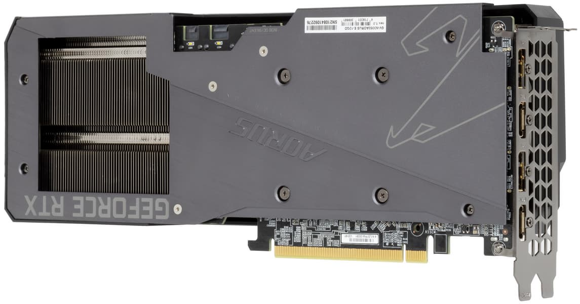 Начиная с серии GeForce RTX 30 инженеры Nvidia используют для референс-карт (и рекомендуют использовать партнерам) более компактную PCB и новую систему охлаждения, частично продувающую радиатор насквозь. В Gigabyte воспользовались этим решением, хотя PCB все-таки получилась не такой короткой, как у карт Founders Edition. Основа кулера — пластинчатый никелированный радиатор с тепловыми трубками, непосредственно контактирующими с GPU.