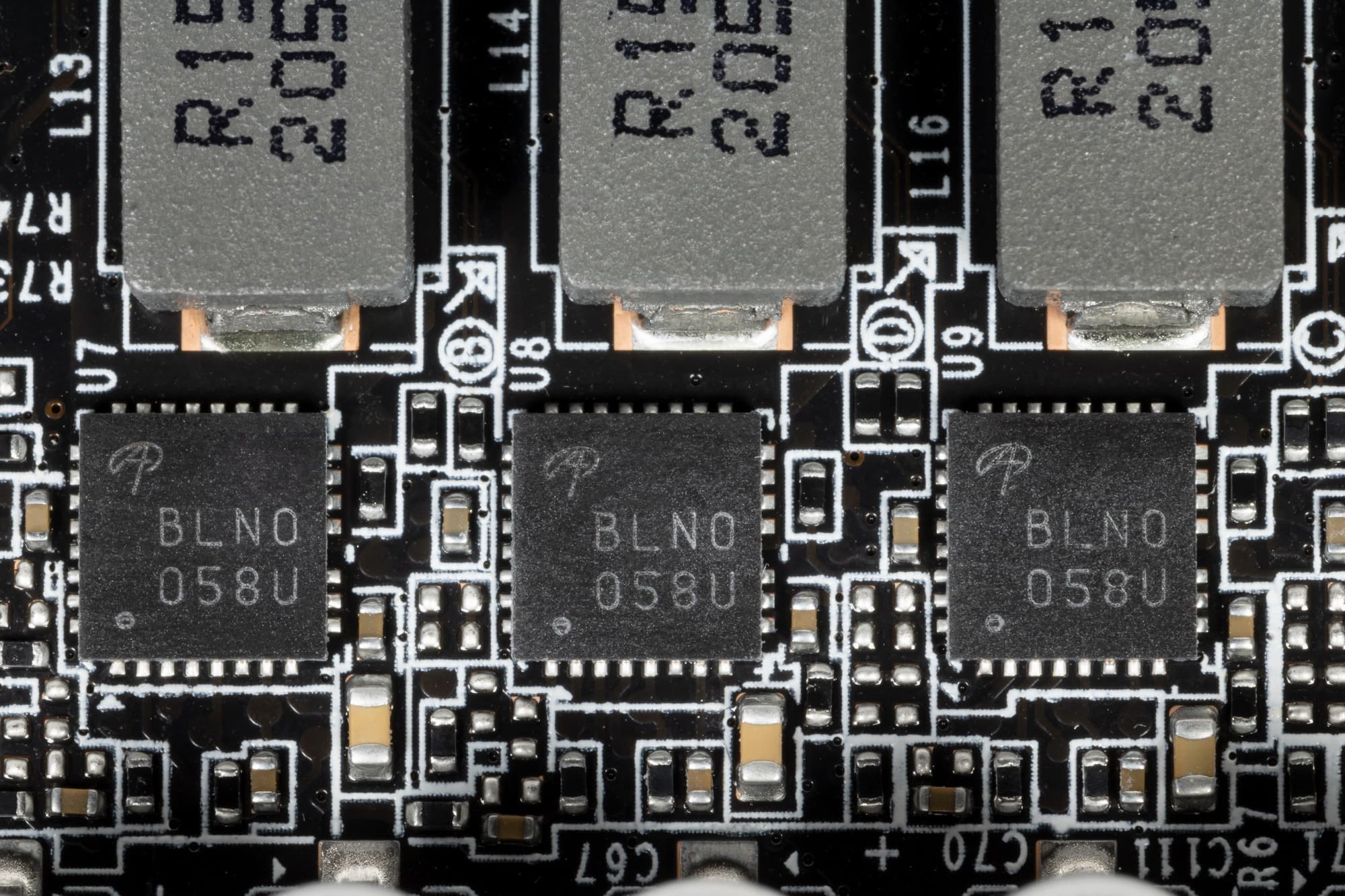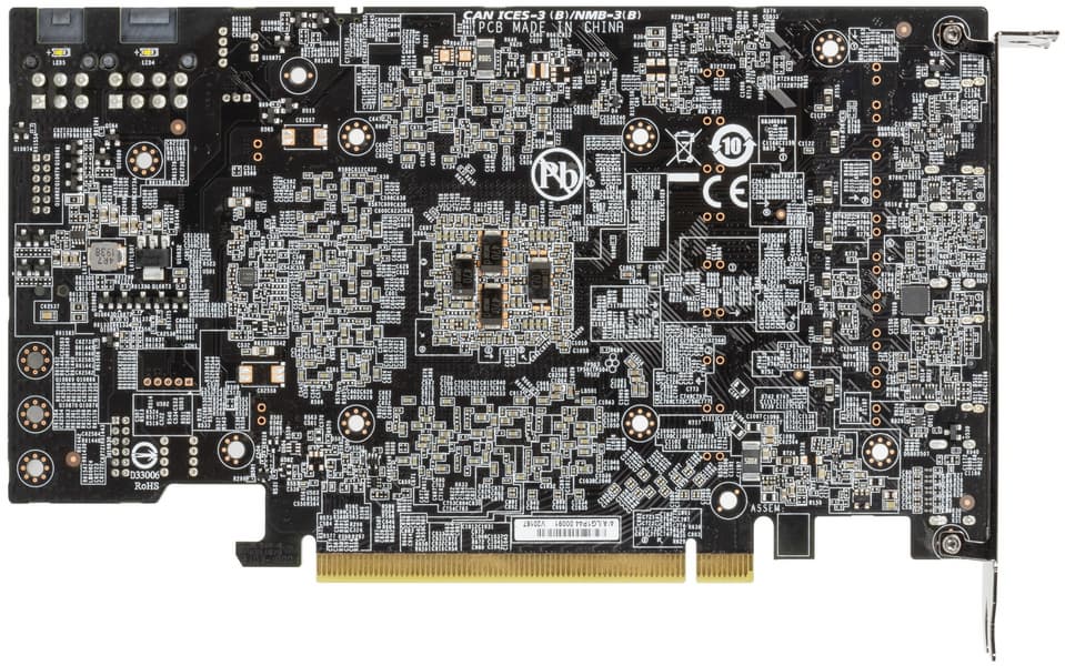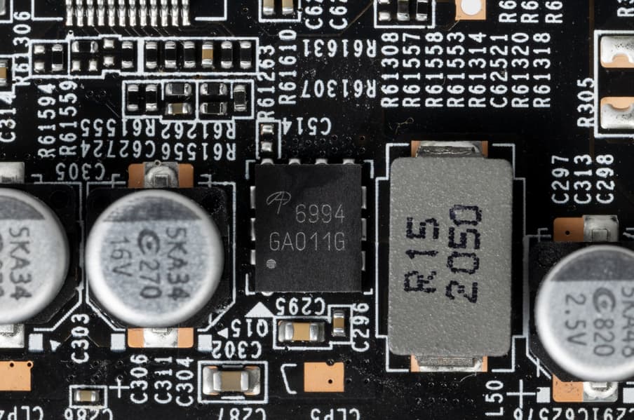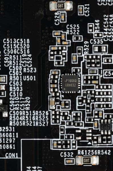 В преобразователе питания, традиционно для всех видеокарт Nvidia, используются транзисторные сборки DrMOS — в данном случае для GPU применяются AOZ5332QI (Alpha & Omega Semiconductor), каждая из которых рассчитана максимум на 50 А.
