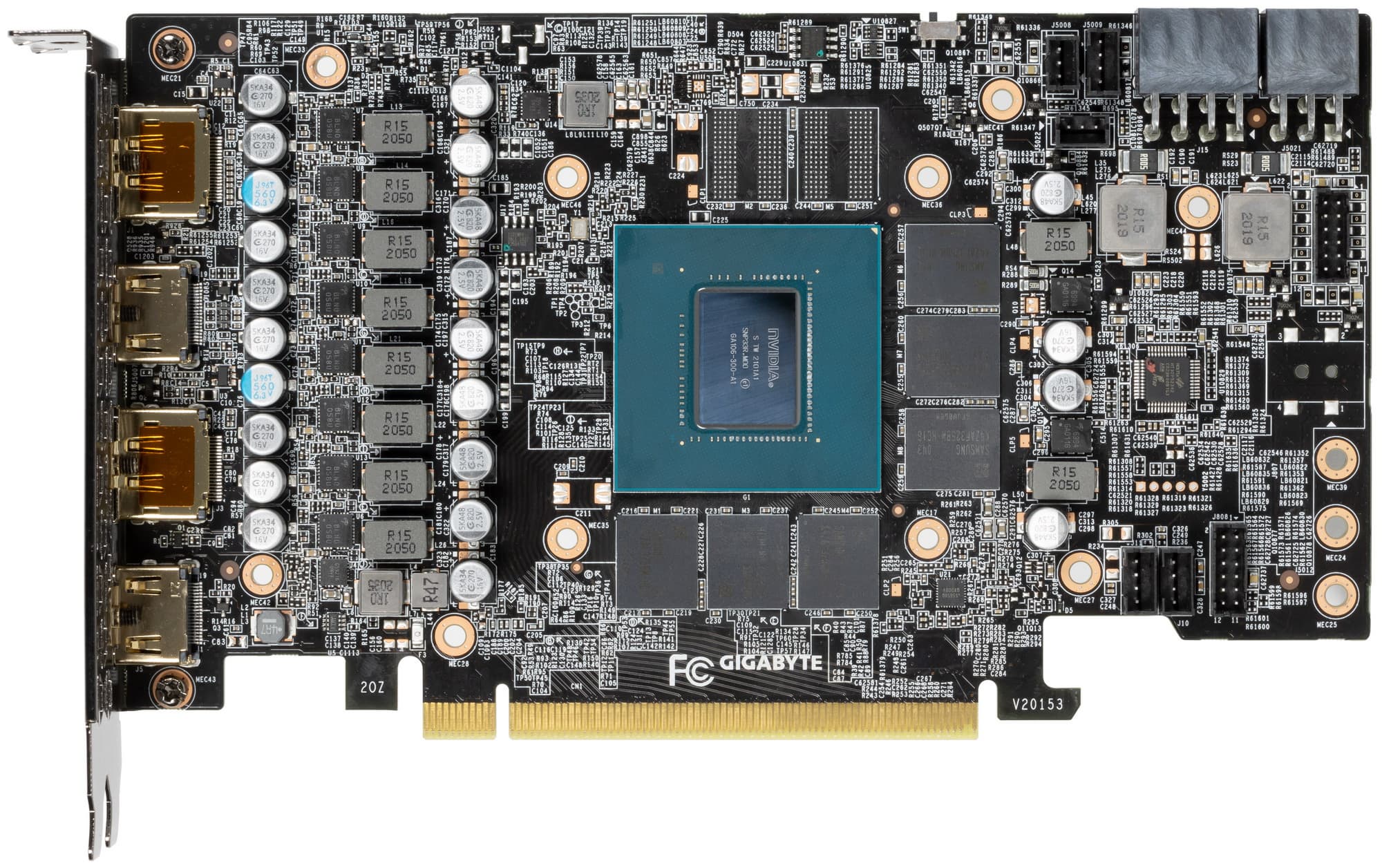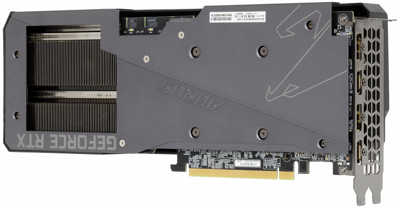 Питание на карту Gigabyte подается через два разъема (один 8-контактный и один 6-контактный). Плата имеет набор видеовыходов, отличающийся от рекомендованного Nvidia (3 DP + 1 HDMI), предоставляя потребителю два HDMI 2.1, а не один.