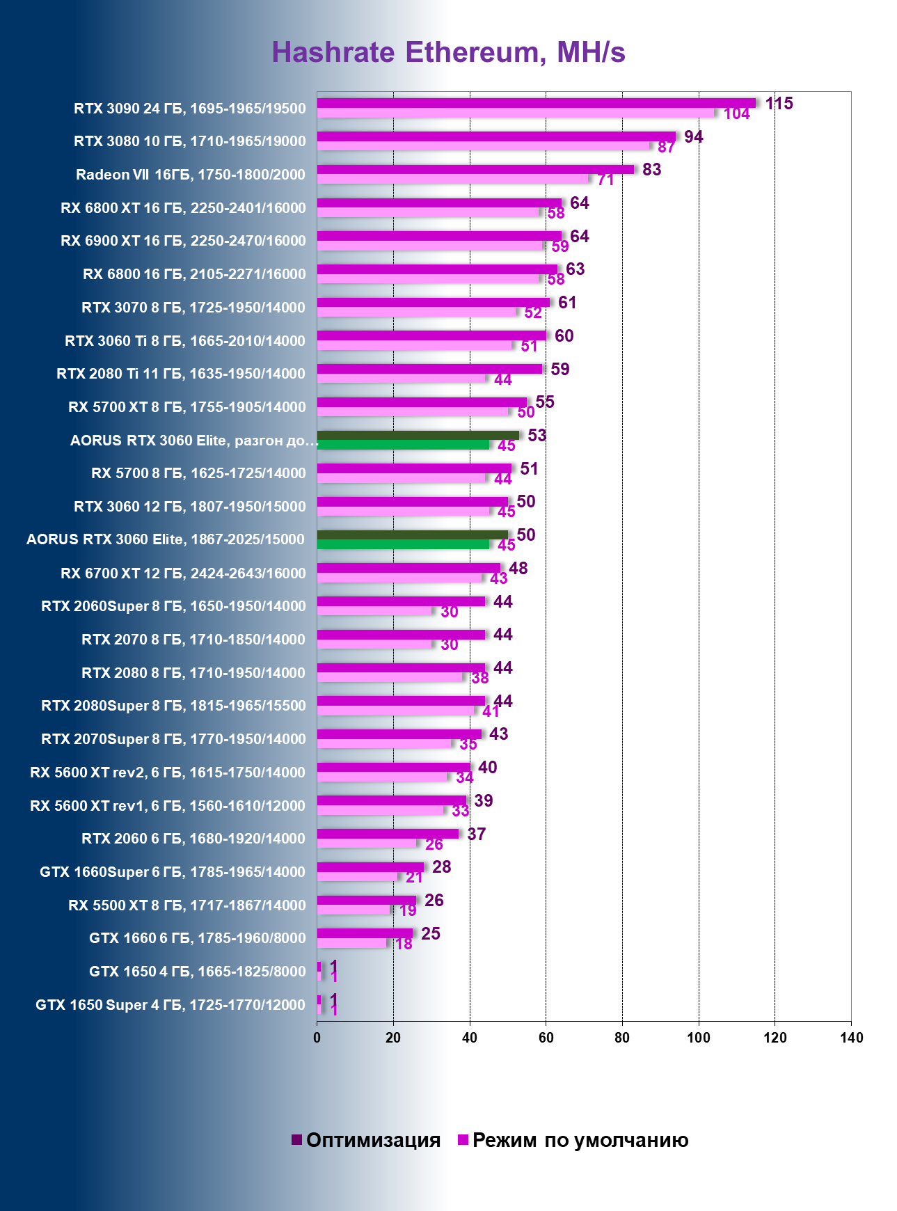 | 15 | Aorus RTX 3060 Elite, 1867—2025/15000 | 50 | 440 | 88 000 |