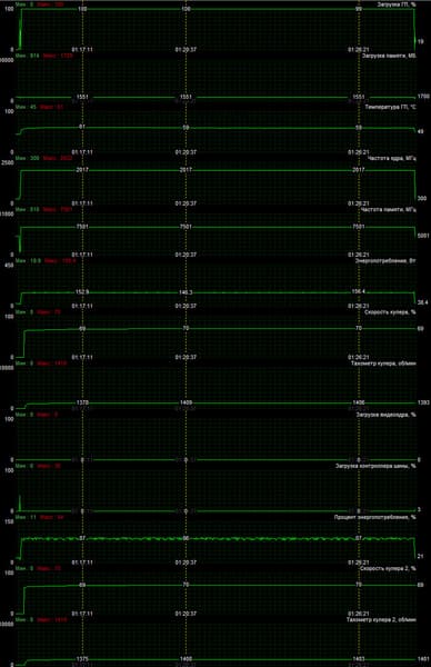 - по умолчанию (лимит потребления снижен до 70%, частота GPU снижена на 200 МГц, частота памяти по умолчанию, вентиляторы выставлены в ручном режиме на 70%)