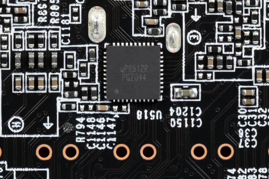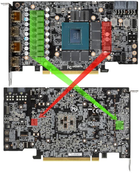 Зеленым цветом отмечена схема питания ядра, красным — памяти. ШИМ-контроллер uP9512R (uPI Semiconductor) отвечает за работу фаз питания графического процессора.