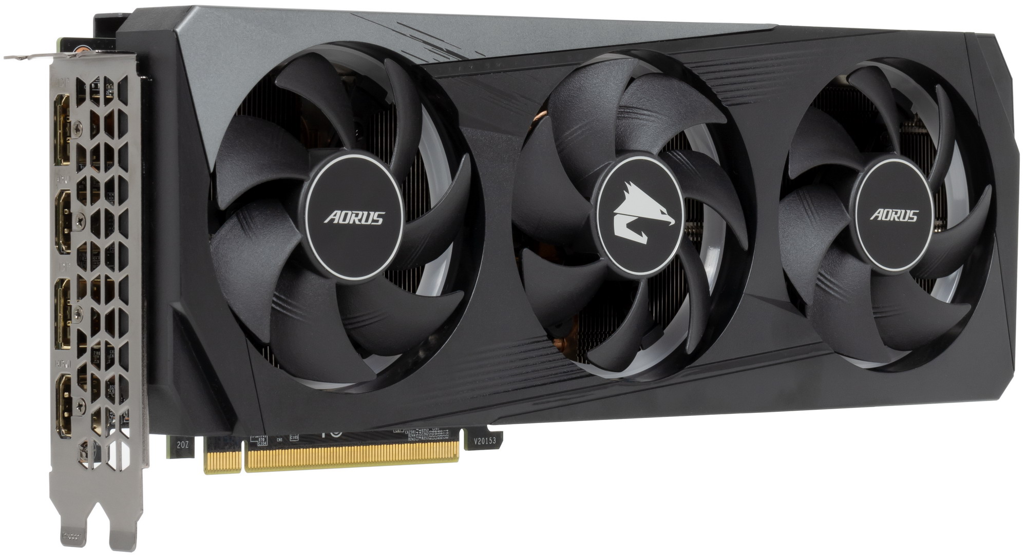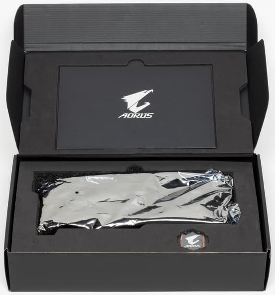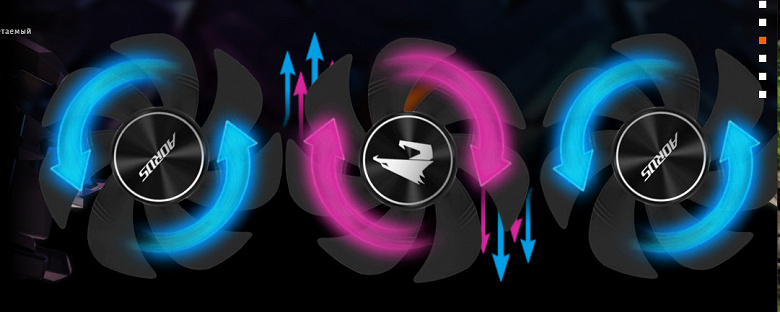 Подсветка у карты реализована на верхнем торце, где светится логотип Aorus (и сигнал остановленных вентиляторов при малой нагрузке на карту), а также по ободу каждого вентилятора.