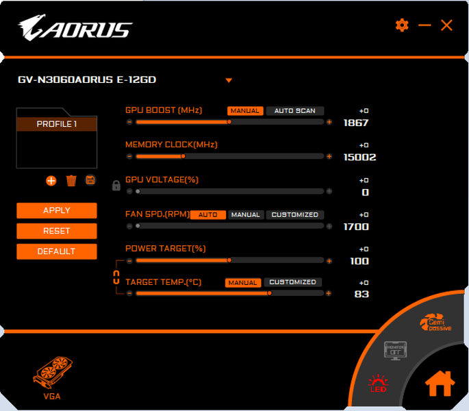 Фирменная утилита Gigabyte Aorus Engine довольно простая, но позволяет управлять всеми параметрами работы видеокарты, обеспечивает мониторинг состояния ускорителя и устанавливает утилиту управления подсветкой.