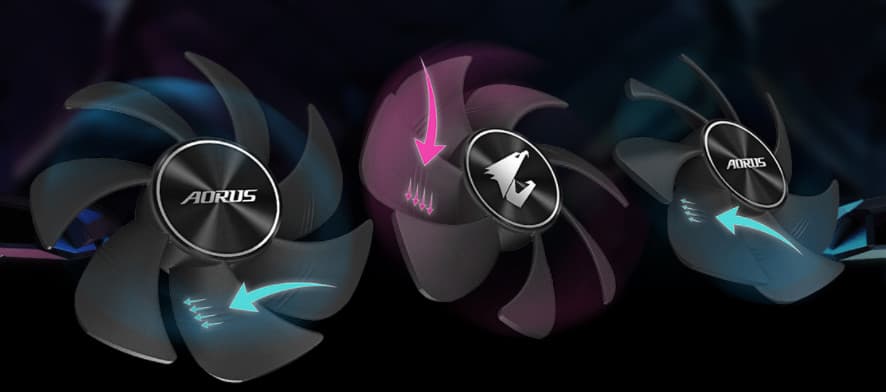 Для минимизации турбулентности воздуха меж вентиляторами средний из них вращается в противоположную сторону, и все три вентилятора создают некий «эффект шестеренок».