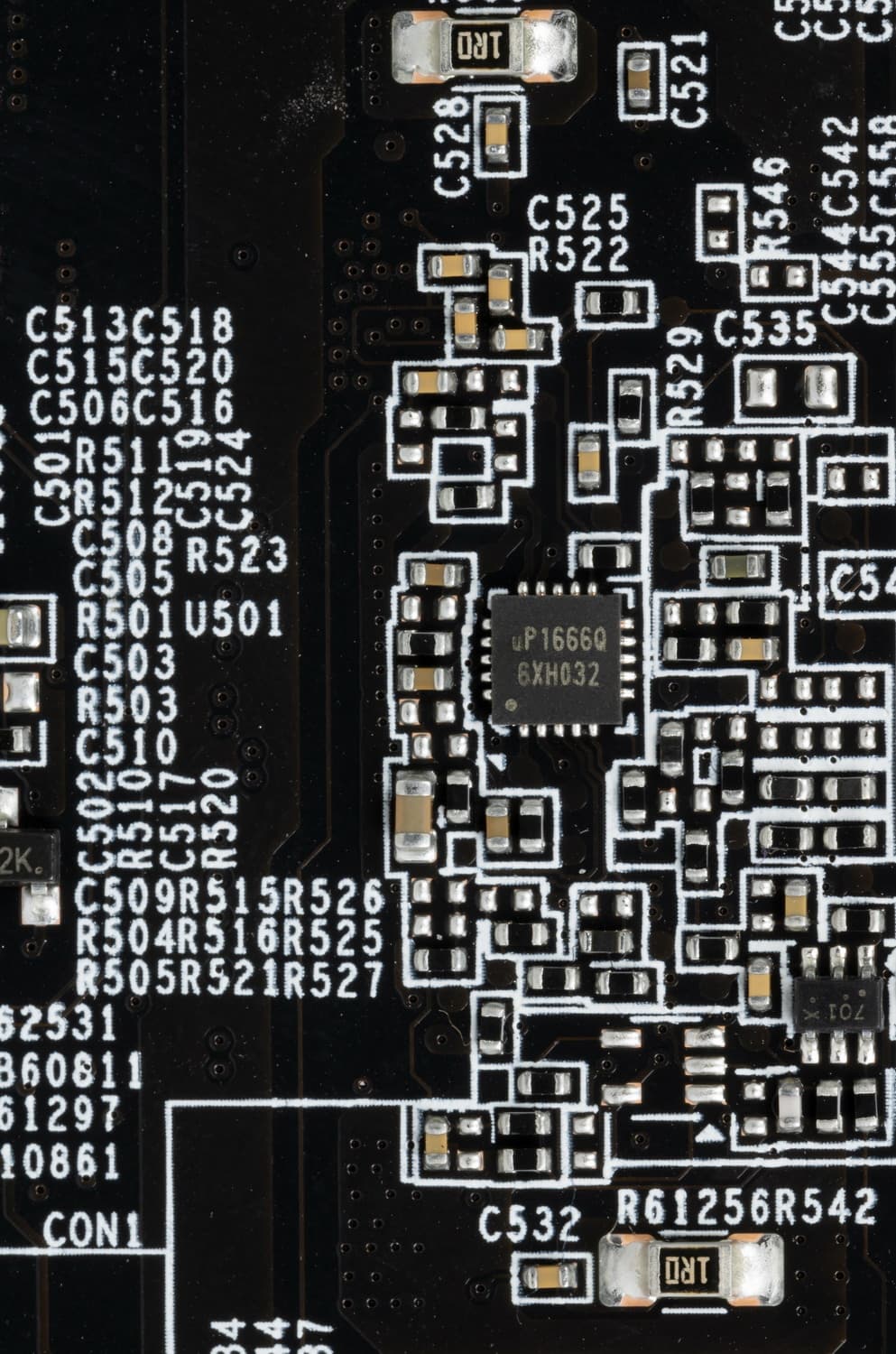 А контроллер uP1666Q управляет двумя фазами питания микросхем памяти. Оба контроллера расположены на обороте печатной платы.