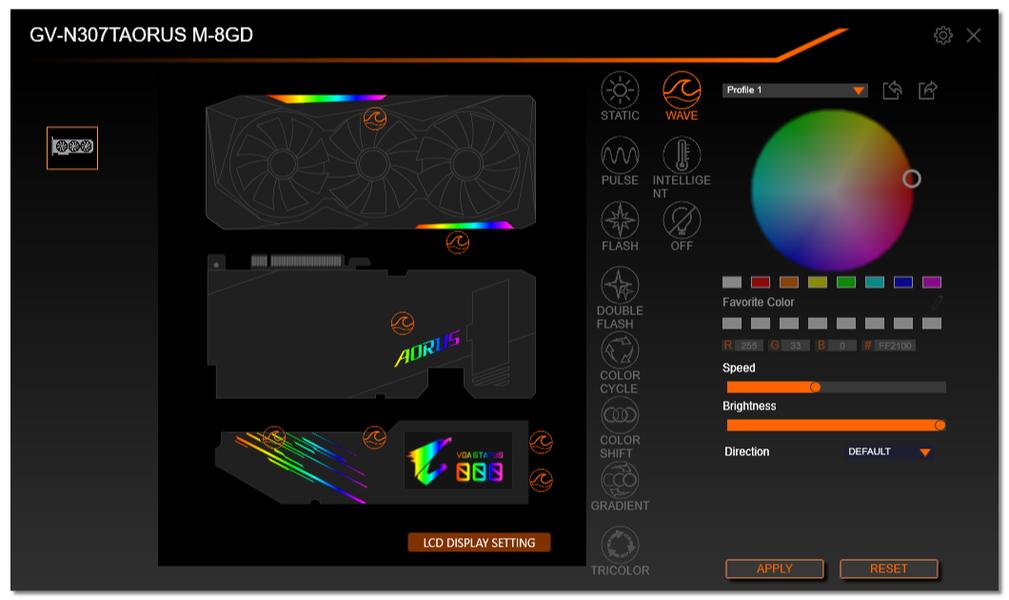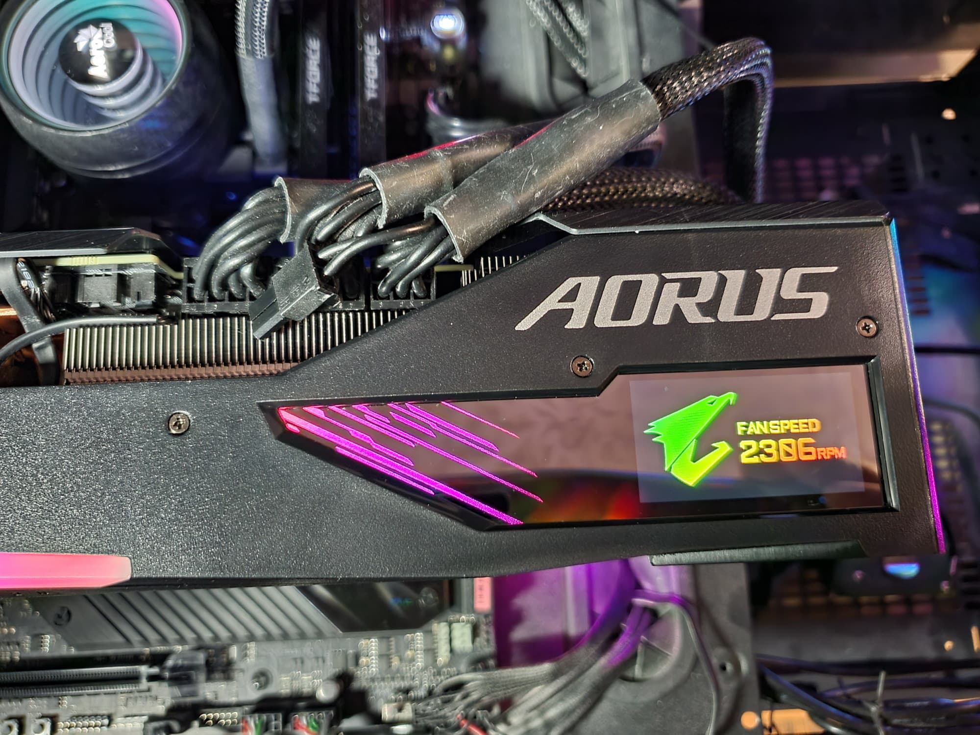 Подсветка у карты реализована на торце (логотип и название серии карты), а также по краям кожуха СО и на вставке в задней пластине, так что пользователь будет наслаждаться зрелищем как при обычном горизонтальном размещении видеокарты в корпусе, так и при вертикальной установке через райзер. На торце кожуха имеется небольшой экран.