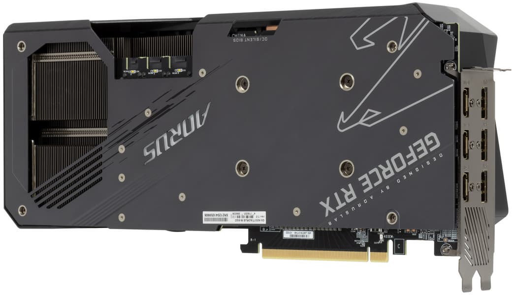 При этом инженеры Gigabyte воспользовались идеей Nvidia о сквозном продуве радиатора справа, потому СО гораздо длиннее печатной платы, что дает возможность предусмотреть окно в задней пластине для такого продува.