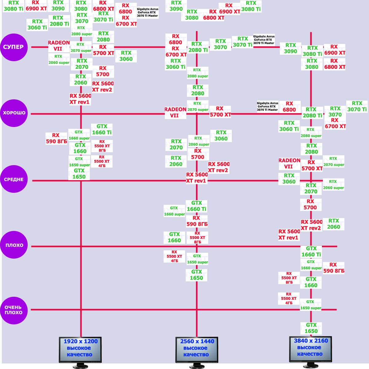 В начале всех обзоров серийных видеокарт мы обновляем свои знания о производительности семейства, к которому относится ускоритель, и его соперников. Все это нами субъективно оценивается по шкале из пяти градаций.