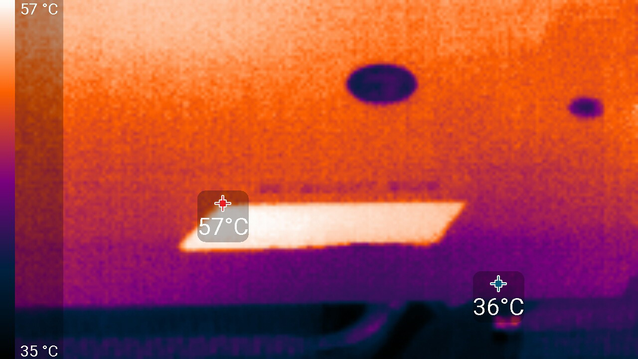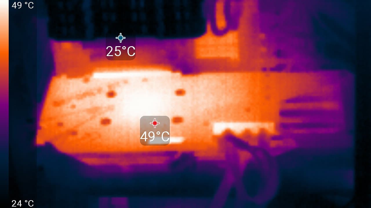 Максимальный нагрев наблюдался в центральной части PCB, в основном около ядра (микросхемы памяти GDDR6X также оказались сильно греющимися элементами).