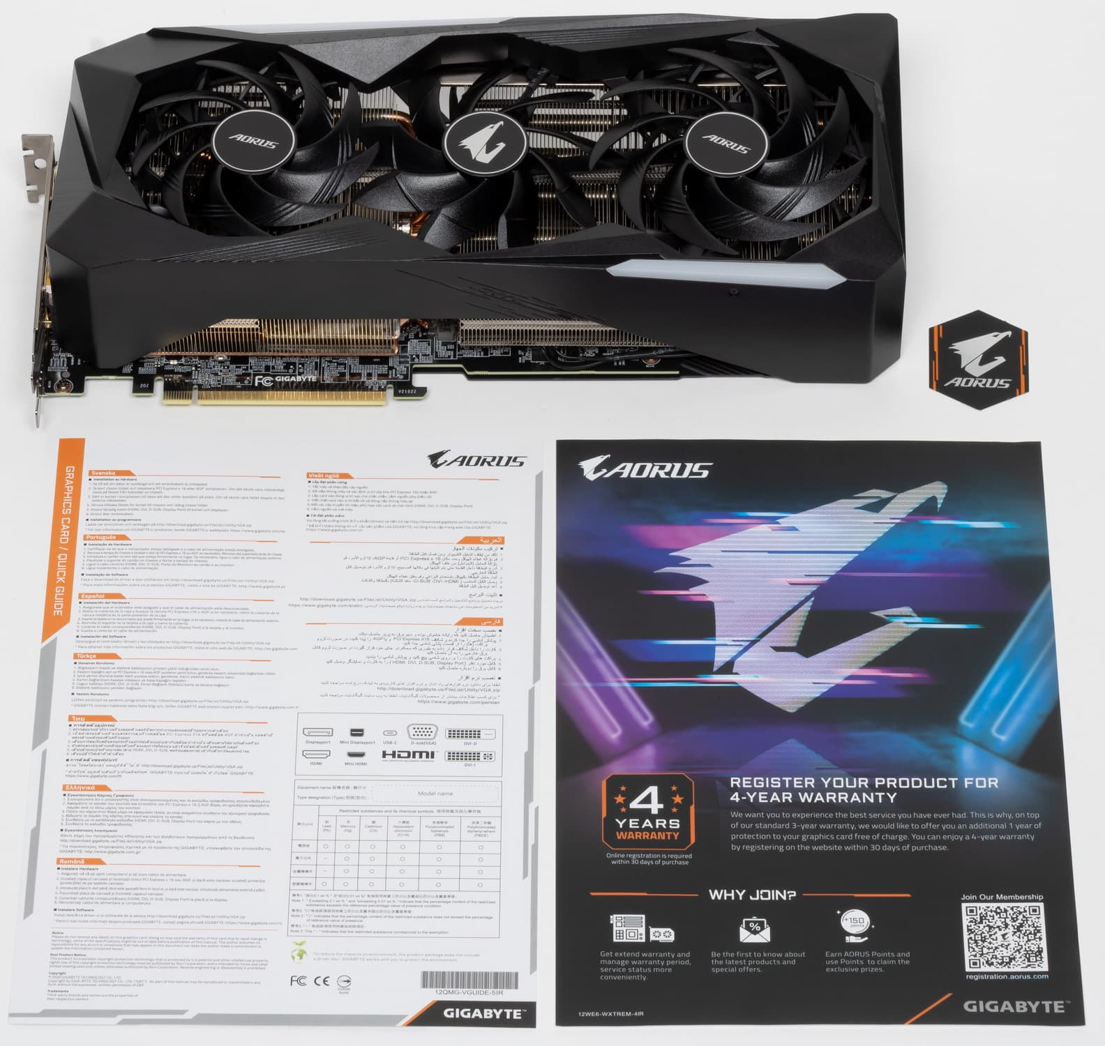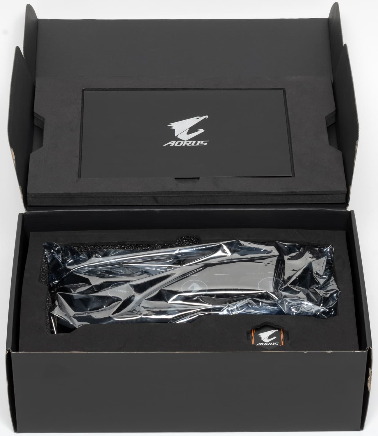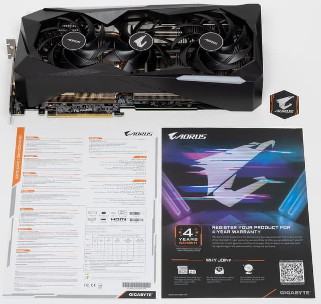 Комплект поставки, кроме традиционного руководства пользователя, включает регистрационную карточку для получения 4-летней гарантии, фирменный стикер Aorus и... собственно, все.