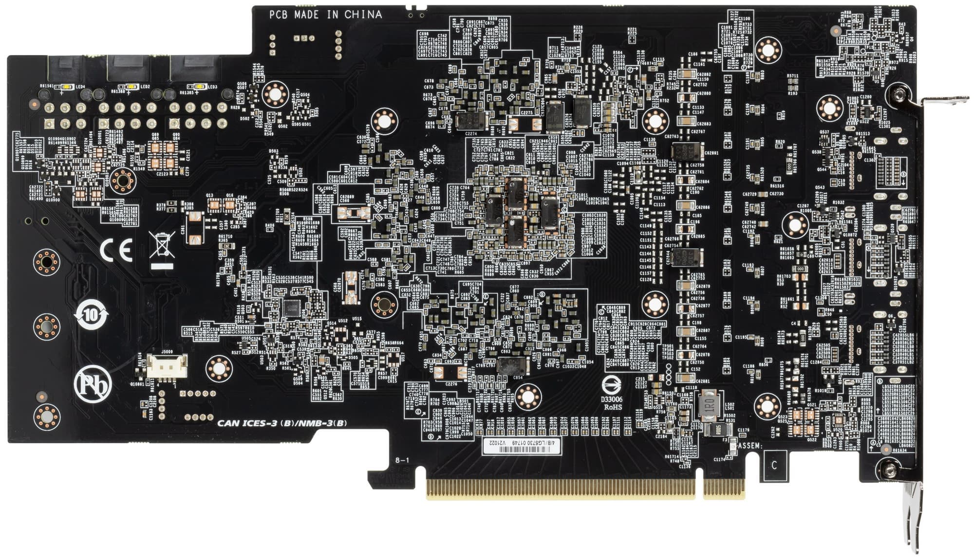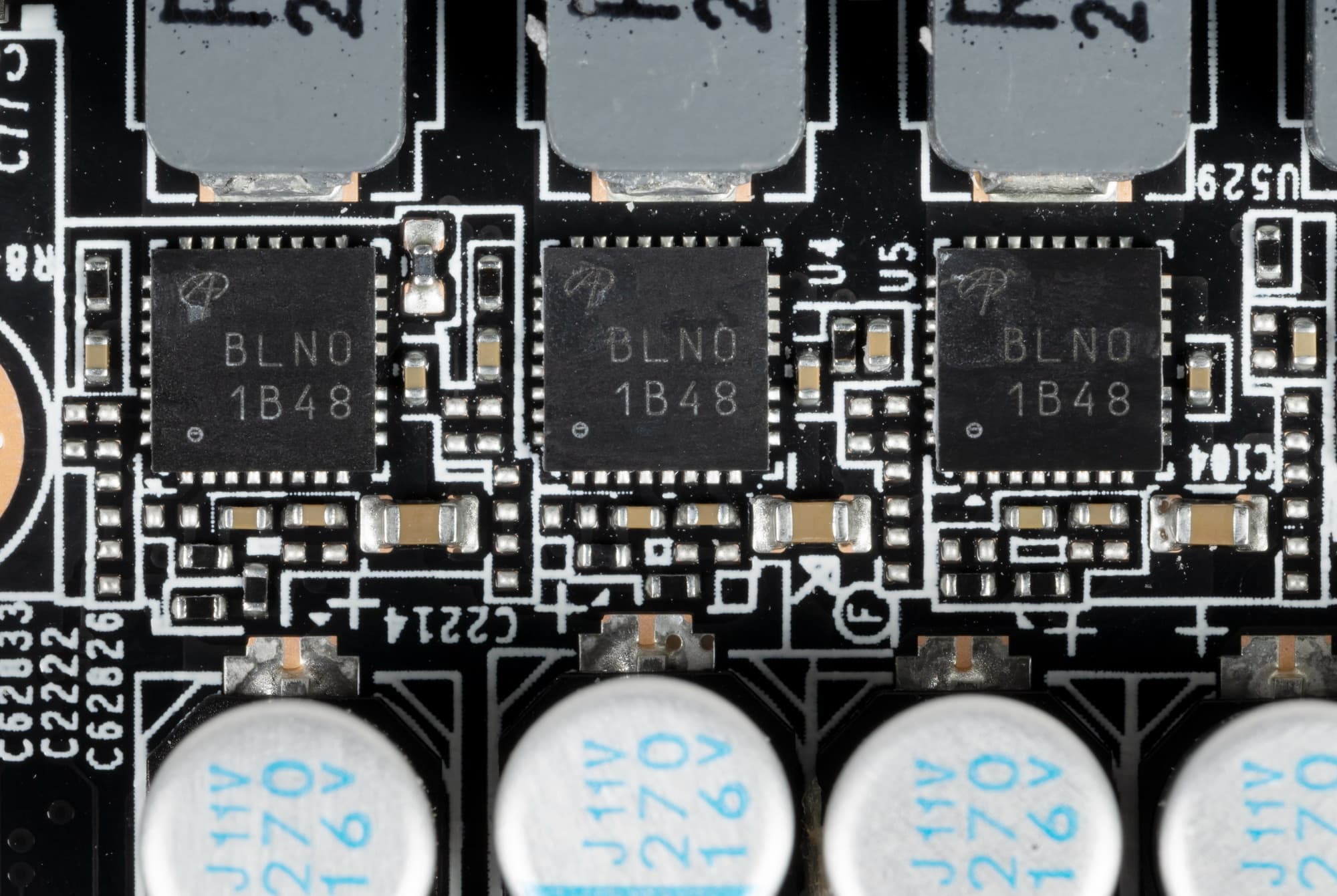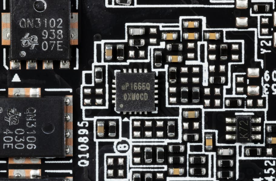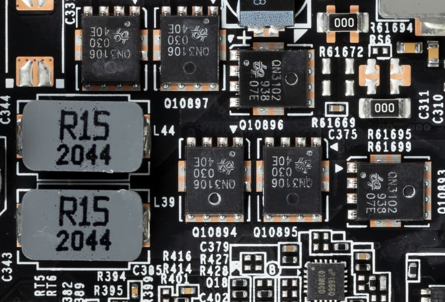 В преобразователе питания GPU, традиционно для всех видеокарт Nvidia, используются транзисторные сборки DrMOS — в данном случае AOZ5311NGI (Alpha & Omega Semiconductor), каждая из которых рассчитана максимум на 50 А.