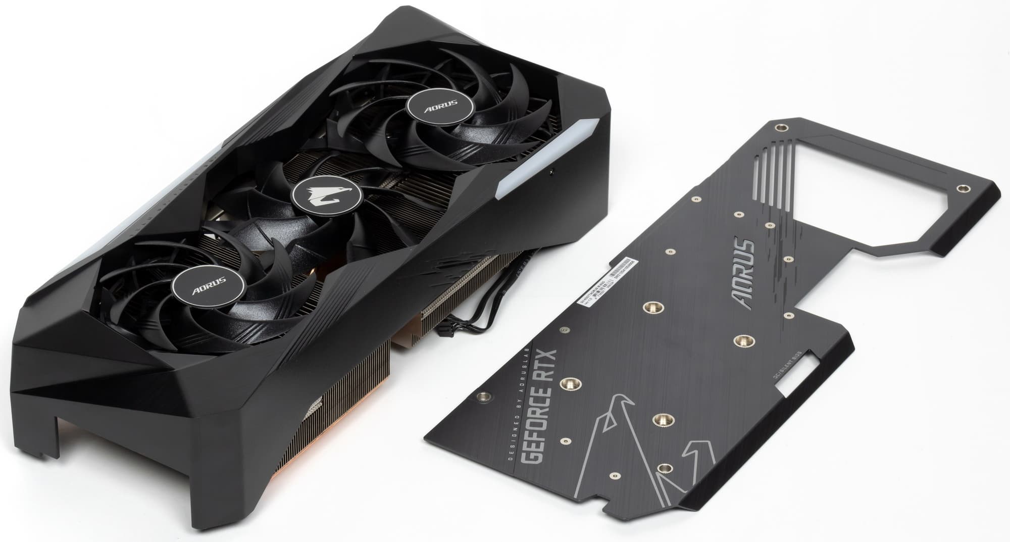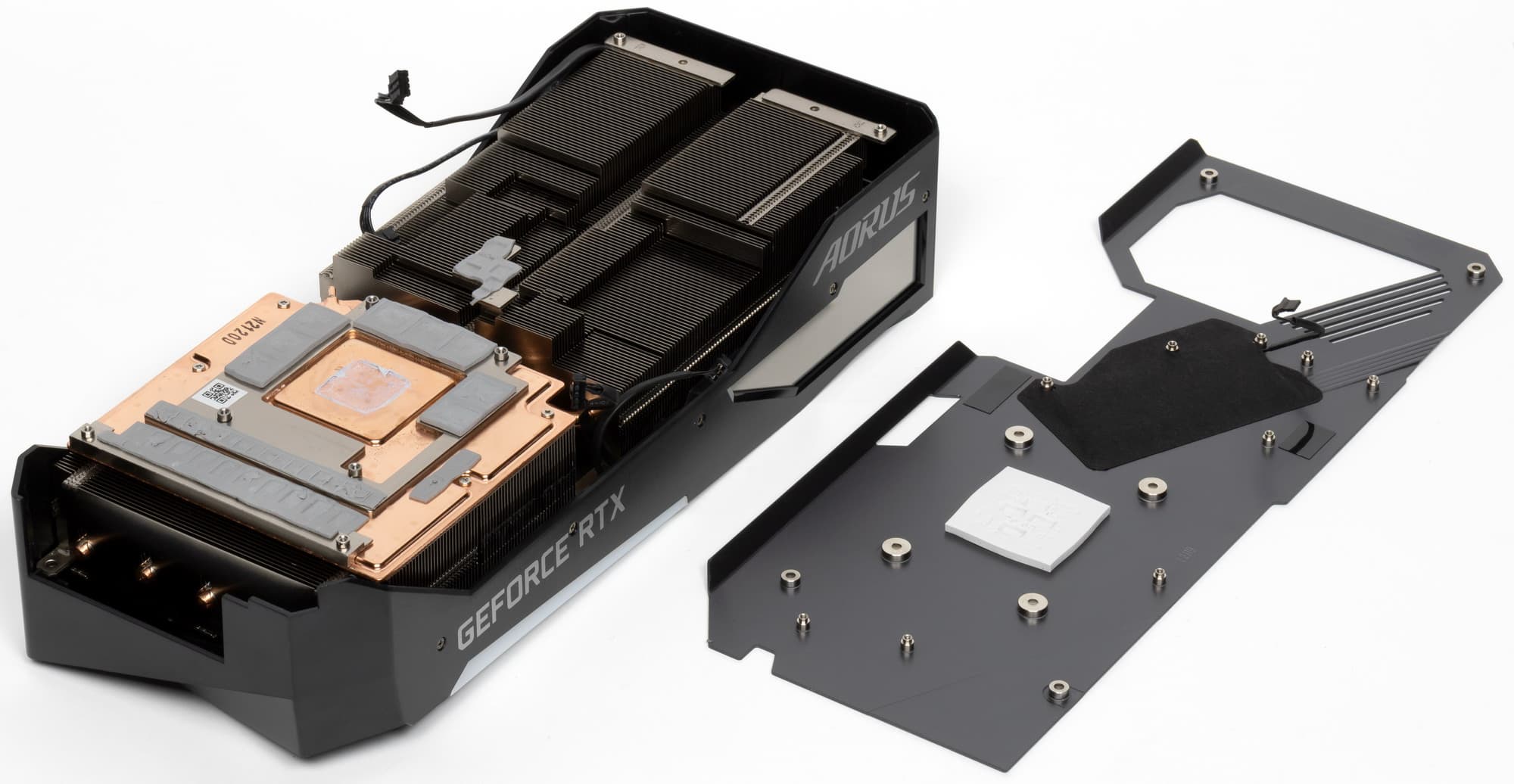Эта же камера с огромной подошвой служит охладителем и для микросхем памяти на лицевой стороне PCB, и для преобразователей питания VRM с помощью термоинтерфейса. Задняя пластина выполнена из алюминия с электрозащитным покрытием и имеет двойное предназначение: служит элементом защиты PCB и через термоинтерфейс участвует в охлаждении PCB в районе GPU, ну и еще несет на себе элемент подсветки в виде лого Aorus.