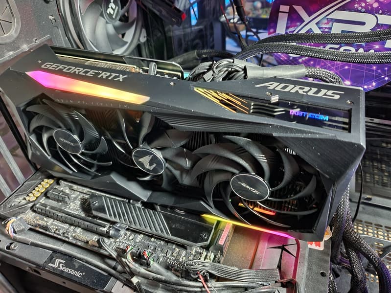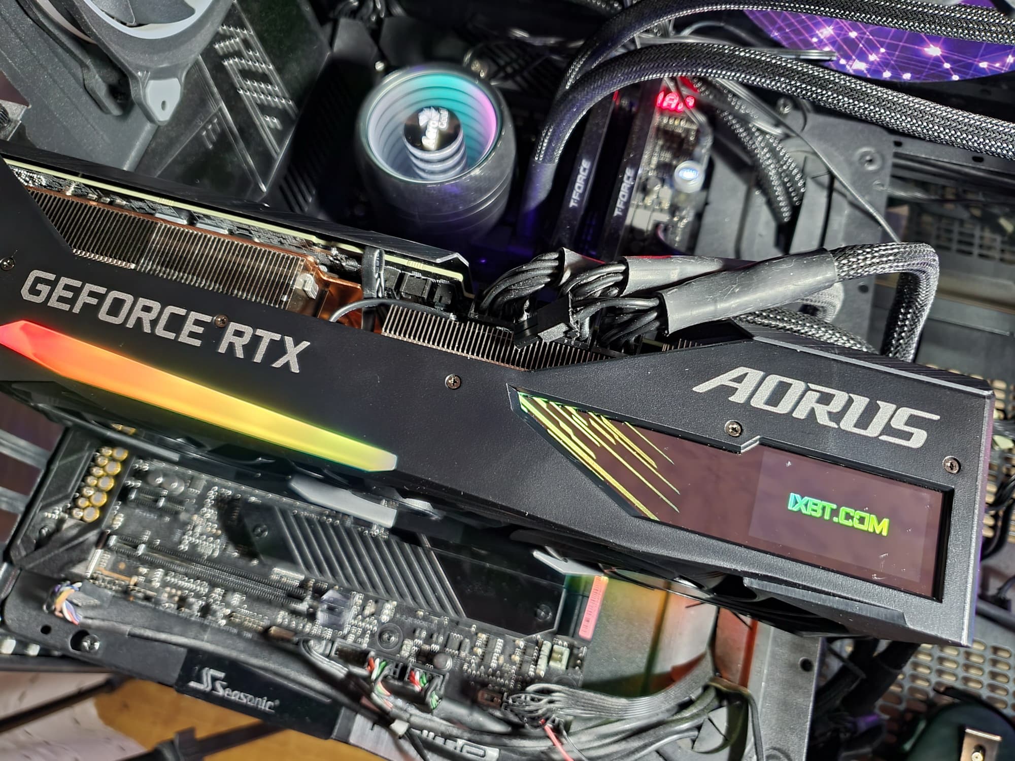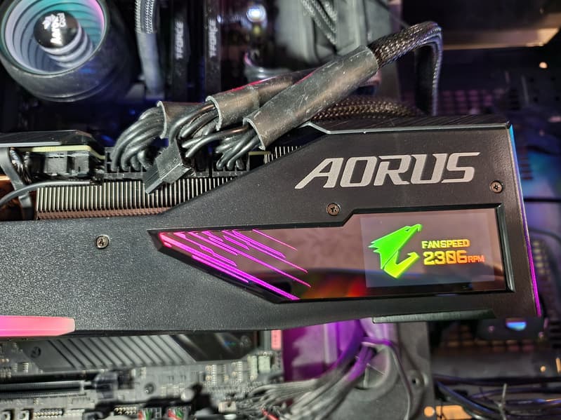 Gigabyte Aorus GeForce RTX 3070 Ti Master 8G (8 ГБ) — очень интересный представитель предфлагманского ускорителя GeForce RTX 3070 Ti. Карта имеет вычурный дизайн не только с подсветкой, но и с экраном на торце, на который можно вывести любые картинки или данные мониторинга, что очень полезно, учитывая крупные цифры информационного табло. Она имеет прекрасный потенциал в плане разгона.