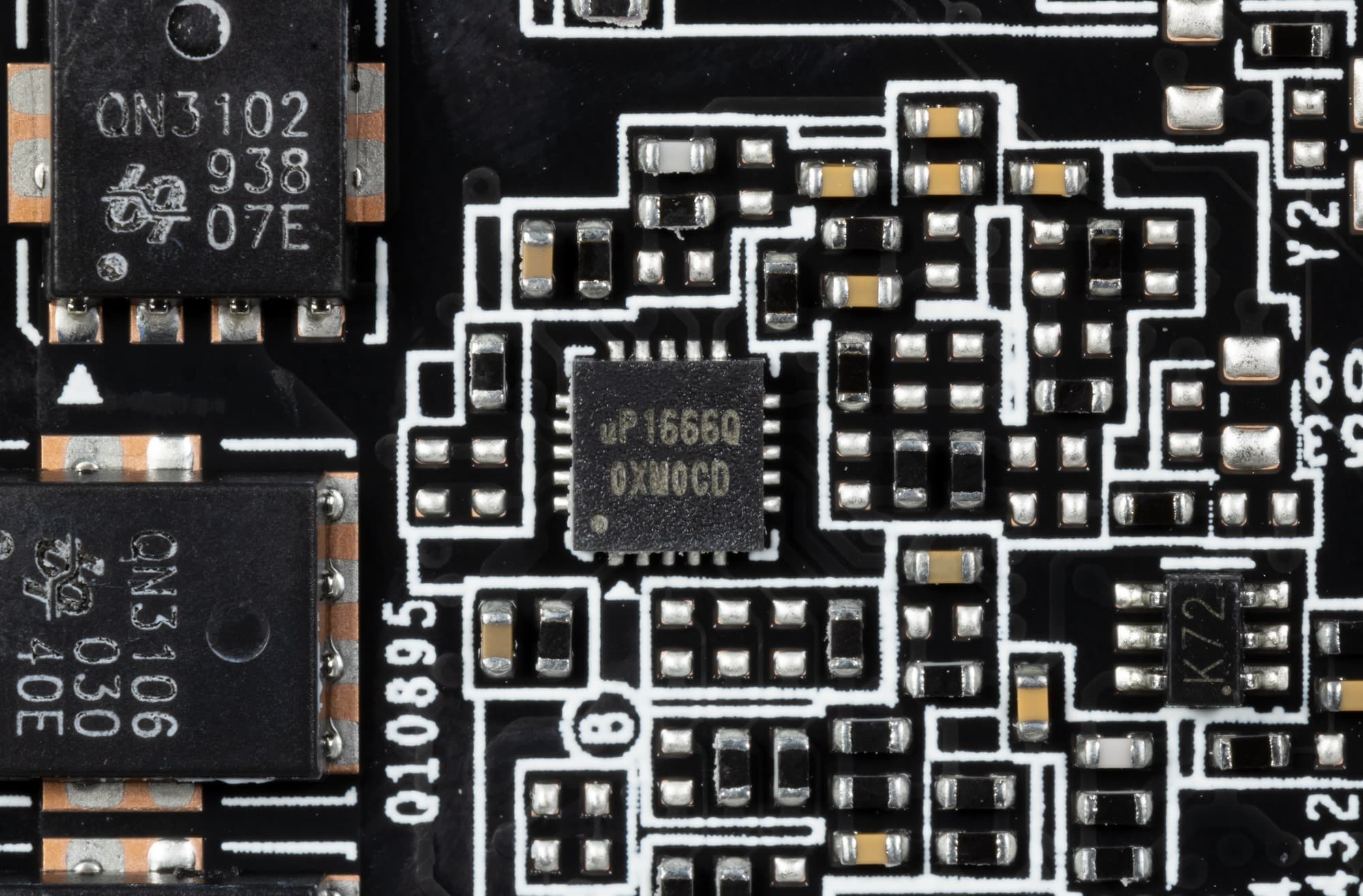 На той же стороне имеется другой ШИМ-контроллер uPI Semiconductor uP1666Q, который управляет 2-фазной схемой питания микросхем памяти.