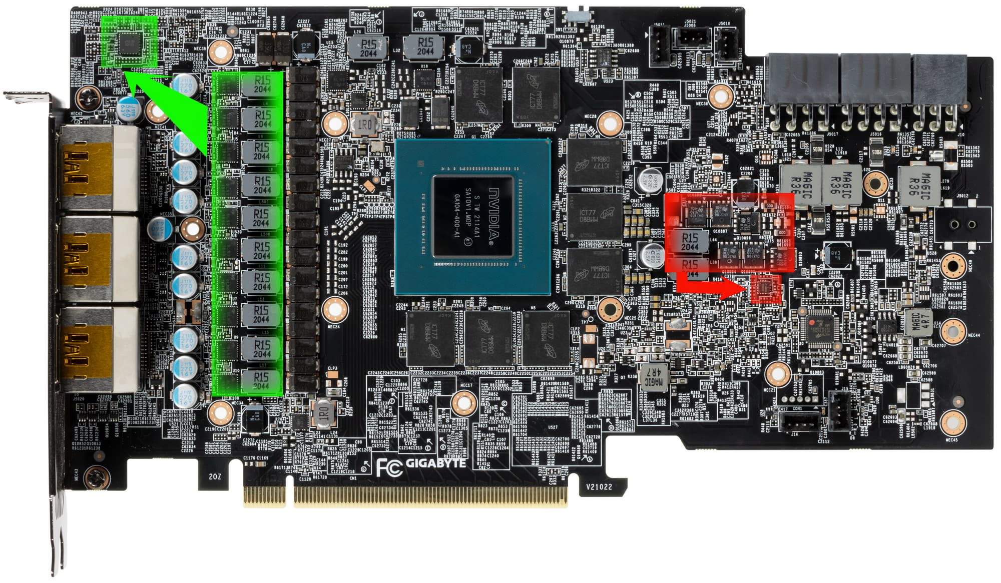Суммарное количество фаз питания у карты Gigabyte — 12 фаз, из которых 2 — на память, а 10 — на GPU.