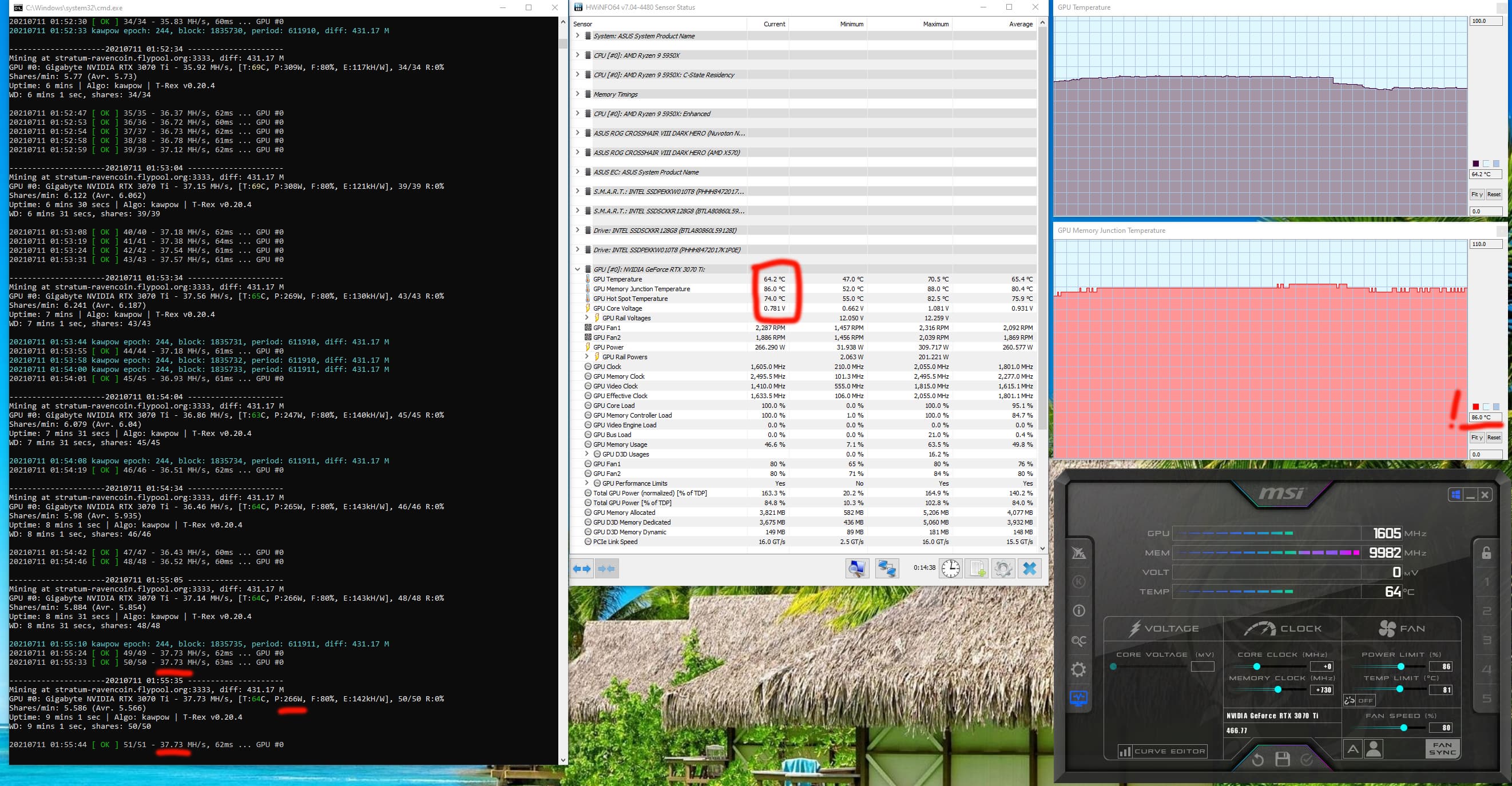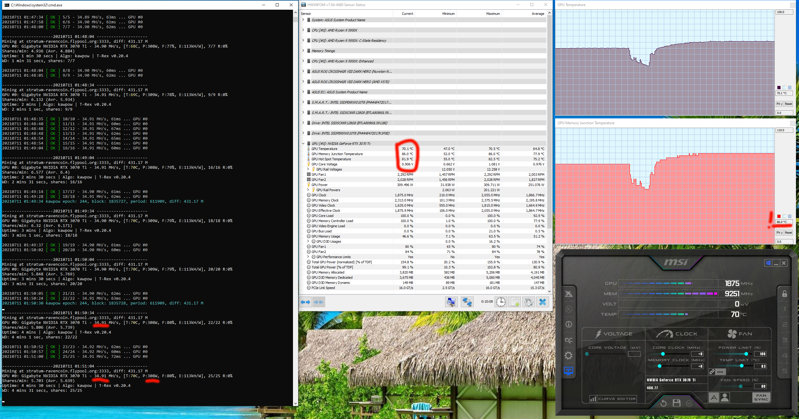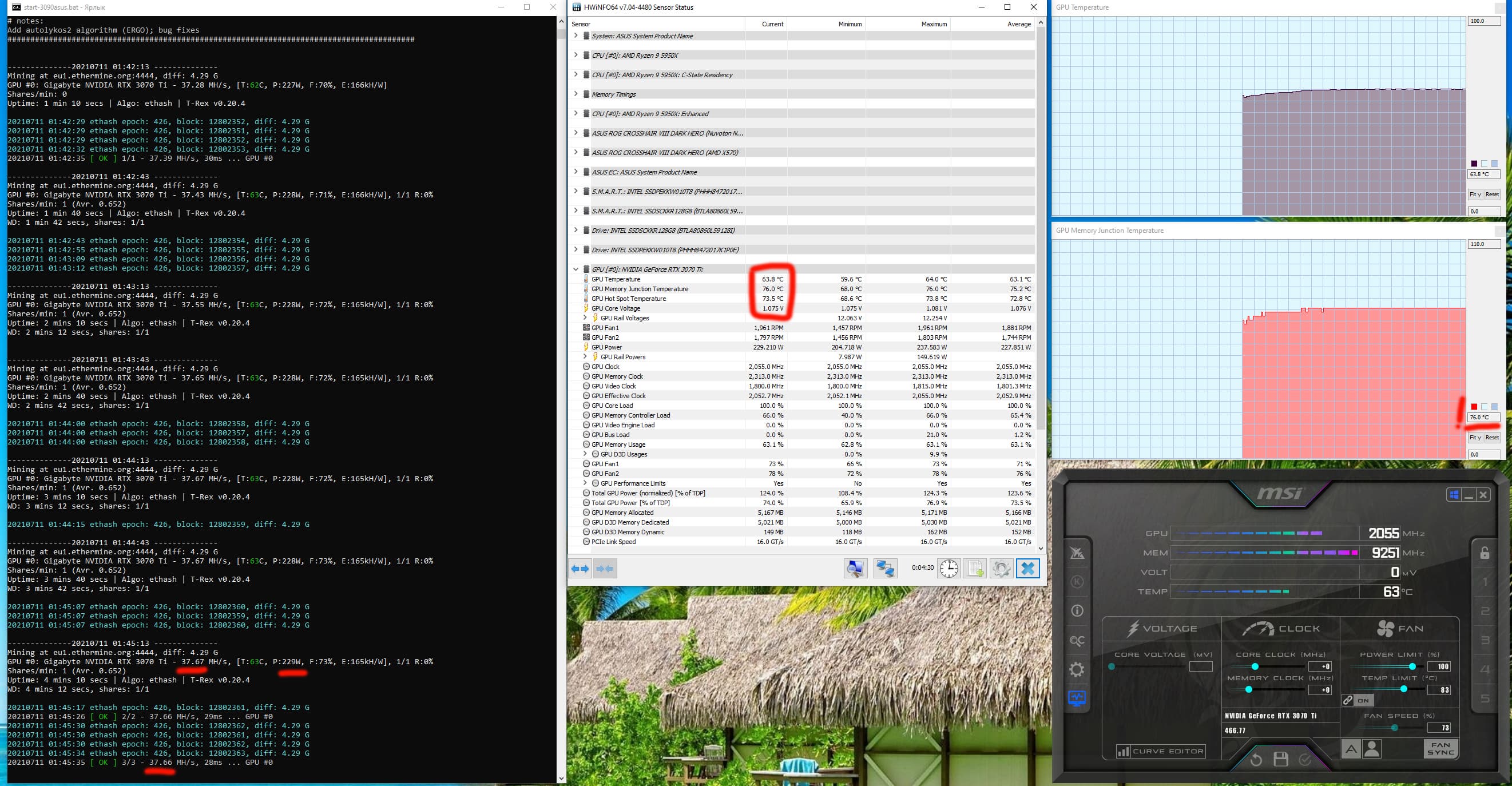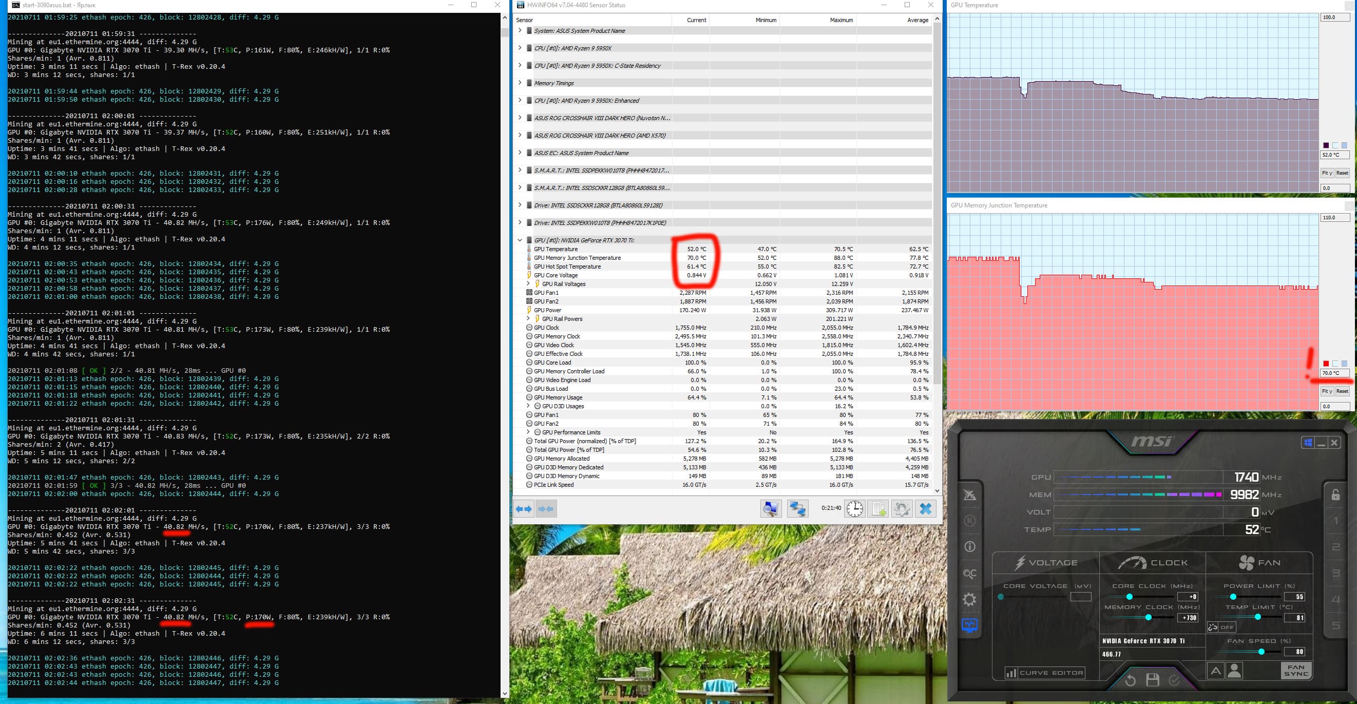 Оптимизация настроек работы видеокарт под майнинг в нашем случае не предусматривает сильного разгона видеопамяти, также обязательным является внешний обдув видеокарт. Особо тщательно надо следить за нагревом GDDR6X у GeForce RTX 3070Ti/3080/3080Ti/3090, ибо максимум для этой памяти — 110 градусов, и она долго не проживет, постоянно работая в условиях нагрева выше 100 °C. В нашем случае после оптимизации параметров работы карты и принудительного улучшения охлаждения нагрев памяти в майнинге по алгоритму ethash не превышал 70 градусов.
