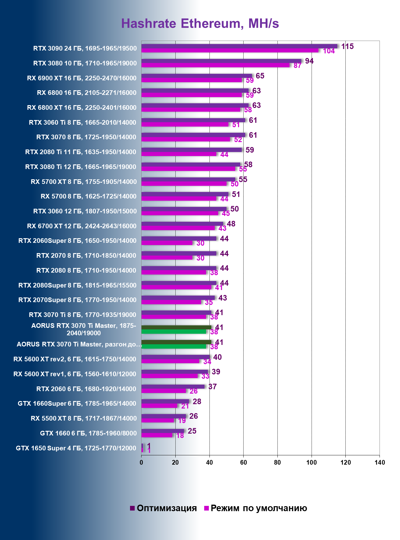 | 05 | Aorus RTX 3070 Ti Master, 1875—2040/19000 | 190 | 20 | 97 000 |