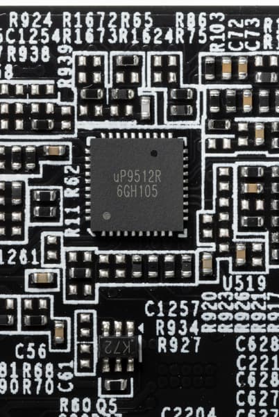 Зеленым цветом отмечена схема питания ядра, красным — памяти. Для управления схемой питания GPU используется ШИМ-контроллер uP9512R (uPI Semiconductor), расположенный на лицевой стороне платы.