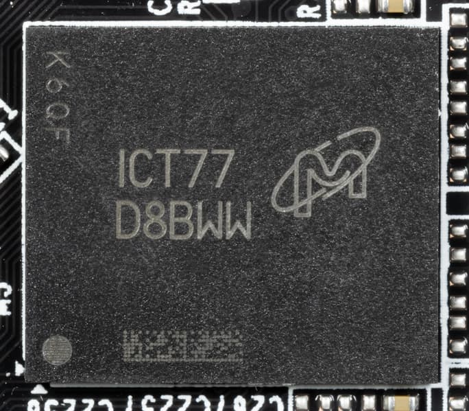 Карта имеет 8 ГБ памяти GDDR6X SDRAM, размещенной в 8 микросхемах по 8 Гбит на лицевой стороне PCB. Микросхемы памяти Micron (GDDR6X, MT61K256M32JE-19) рассчитаны на условную номинальную частоту работы в 4750 (19000) МГц. Расшифровщик кодов на упаковках FBGA находится здесь.