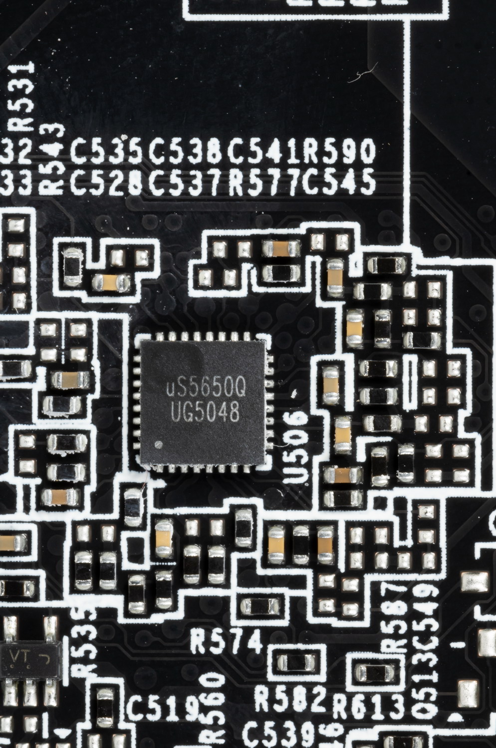 На оборотной стороне имеется контроллер uS5650Q (uPI Semiconductor), отвечающий за мониторинг карты (слежение за напряжением и температурой).