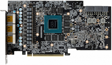 Несмотря на то, что референс-карта у Nvidia получилась очень компактной (я и про саму печатную плату, и про карту вместе с кулером), партнеры калифорнийского гиганта продолжают создавать ускорители просто колоссальных размеров. Даже печатная плата у Gigabyte куда более громоздкая, а ведь ее система охлаждения предусматривает еще и сквозной продув радиатора за печатной платой, так что суммарная длина такого ускорителя точно превысит 30 см.