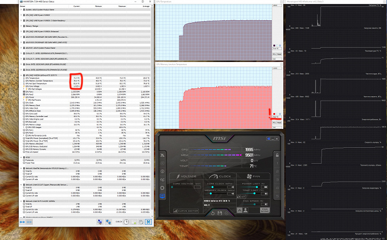 После 2-часового прогона под нагрузкой максимальная температура ядра не превысила 71 градуса, что является очень неплохим результатом для видеокарт предфлагманского уровня. Видеопамять нагревалась до 76 °C. Энергопотребление карты доходило до 317 Вт.