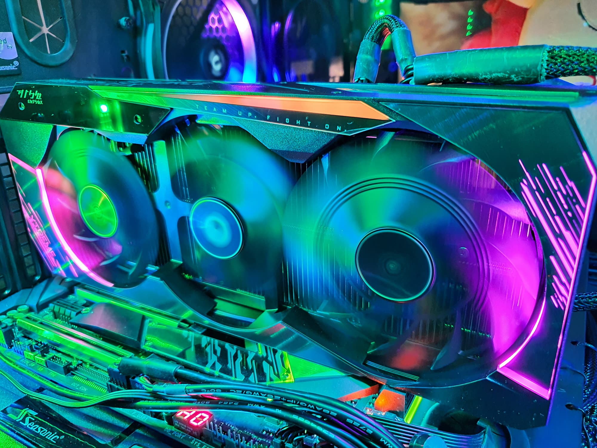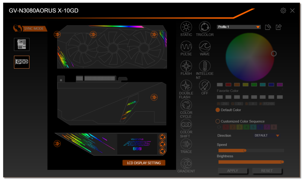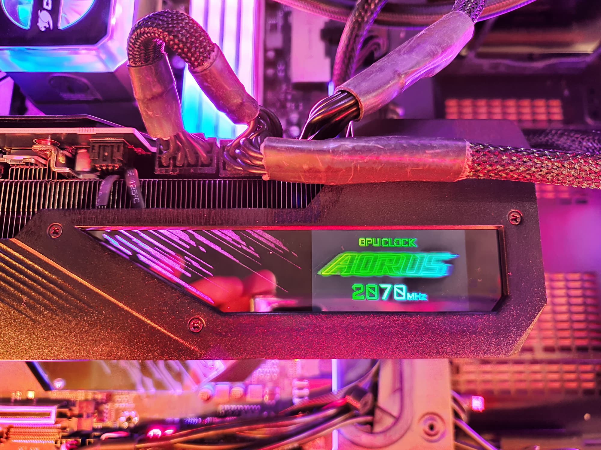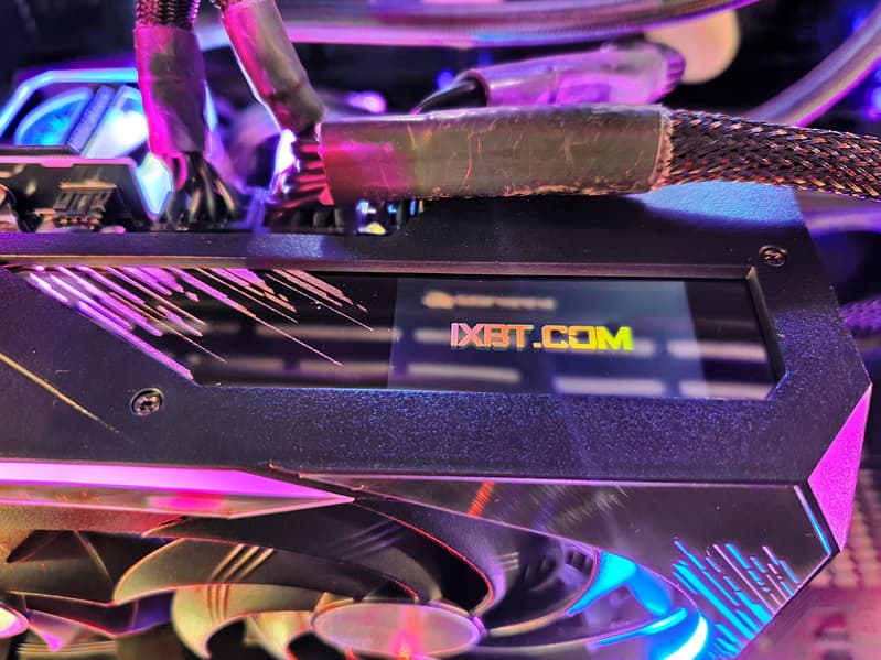 Подсветка у карты реализована на торце (логотип и название серии карты), а также по краям кожуха СО и на вставке в задней пластине, так что пользователь будет наслаждаться зрелищем как при обычном горизонтальном размещении видеокарты в корпусе, так и при вертикальной установке с помощью райзера. На торце кожуха имеется небольшой экран.