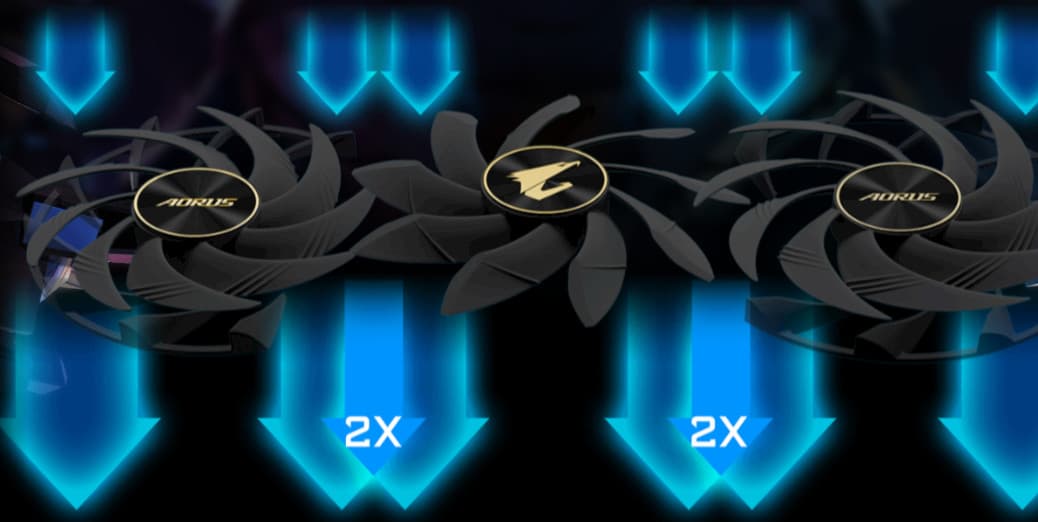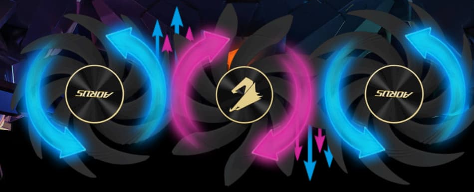 Центральный вентилятор вращается в противоположную сторону относительно крайних, что обеспечивает «эффект шестеренок», помогая бороться с турбулентностью потока воздуха. Вентиляторы расположены на двух уровнях, частично перекрывая лопастями друга друга, поэтому в целом СО получилась очень толстой, а карта перекрывает даже не три, а, фактически, четыре слота в системном блоке.