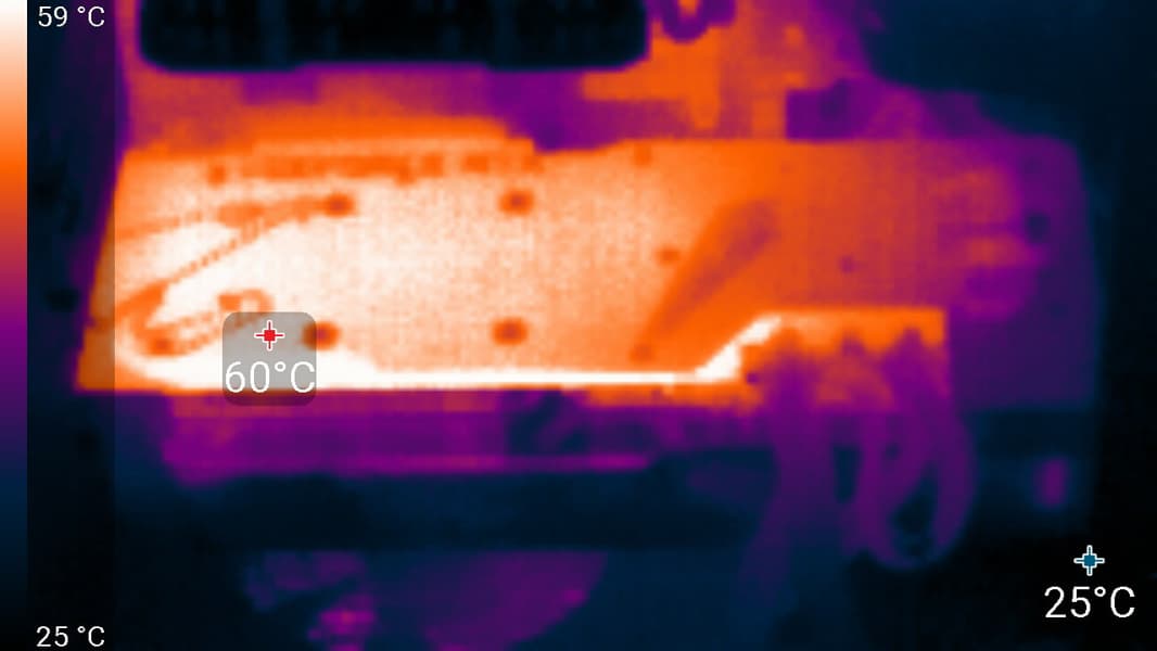 Максимальный нагрев наблюдался в центральной части PCB, в основном около ядра (а микросхемы памяти GDDR6X оказались самыми нагревающимися элементами).