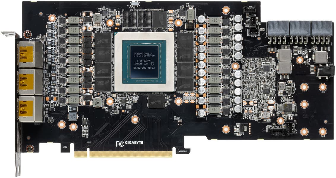 Суммарное количество фаз питания у Nvidia GeForce RTX 3080 Founders Edition — 18: 15 фаз на ядро и 3 на микросхемы памяти. У карты Gigabyte в сумме 20 фаз, из которых 4 — на память, а 16 — на GPU.
